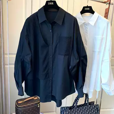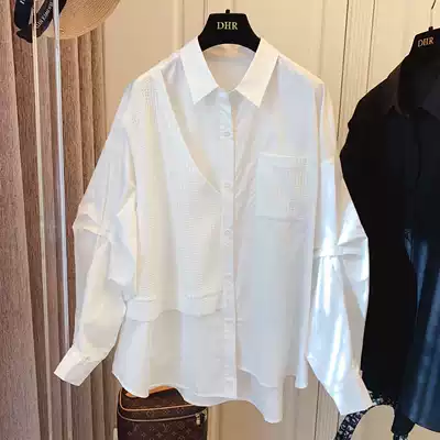 Splice waffle fake two pieces niche design sense Korean loose casual retro long sleeve shirt women 2021 autumn