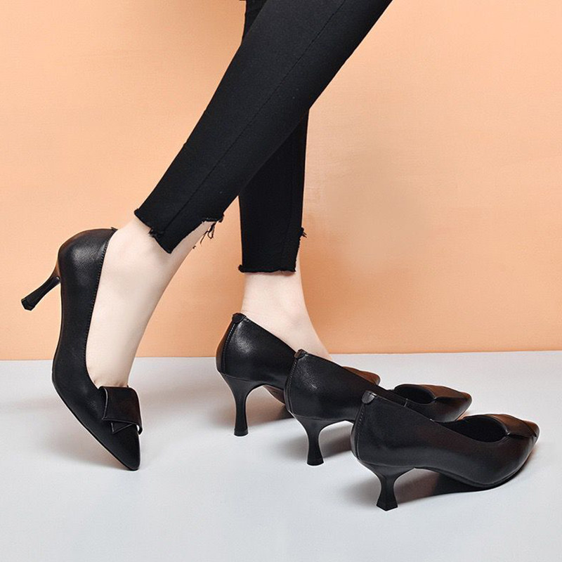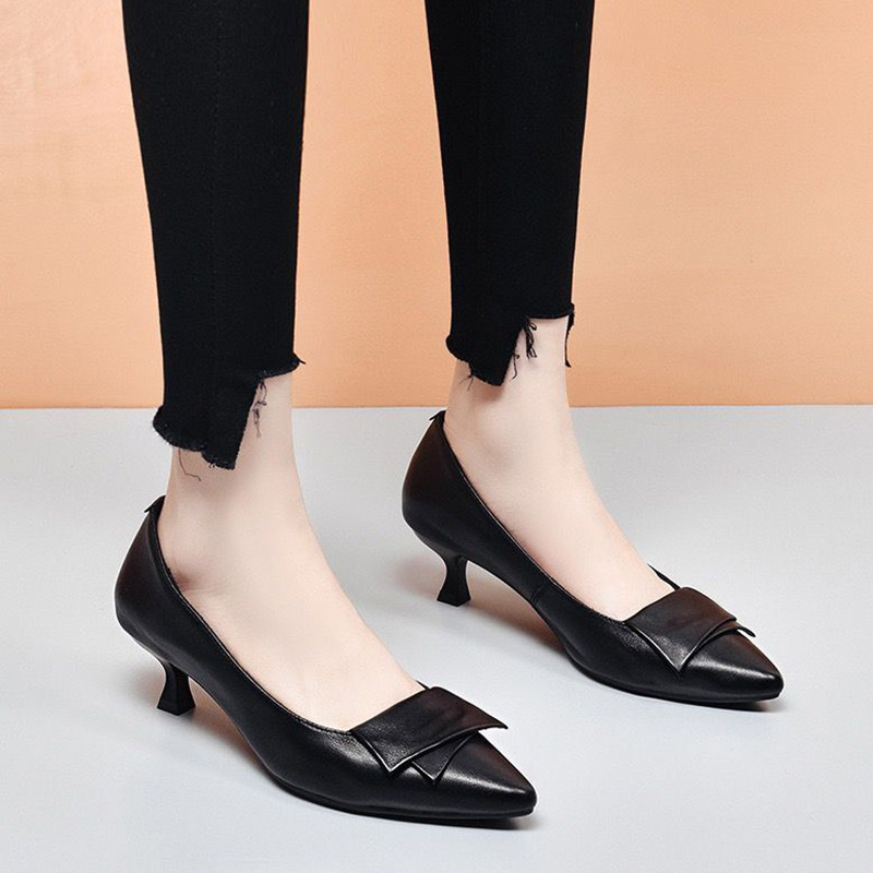 Work shoes leather high heels women spring 2022 new stiletto single shoes women black professional shoes mid-heel low heel