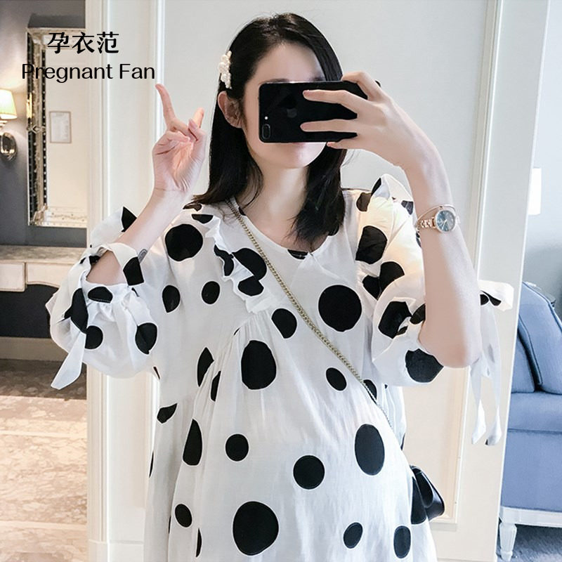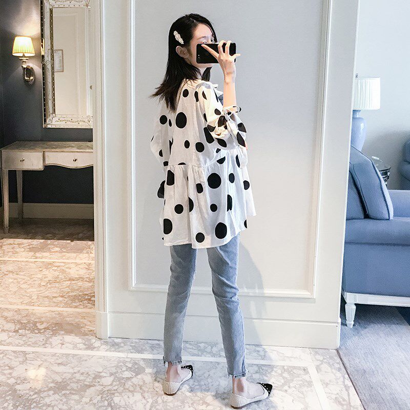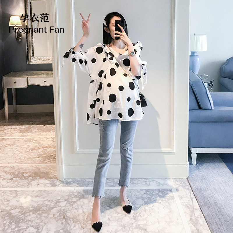 Maternity dress spring and autumn suit out of fashion Korean version wave point loose top jeans two-piece set spring and autumn models