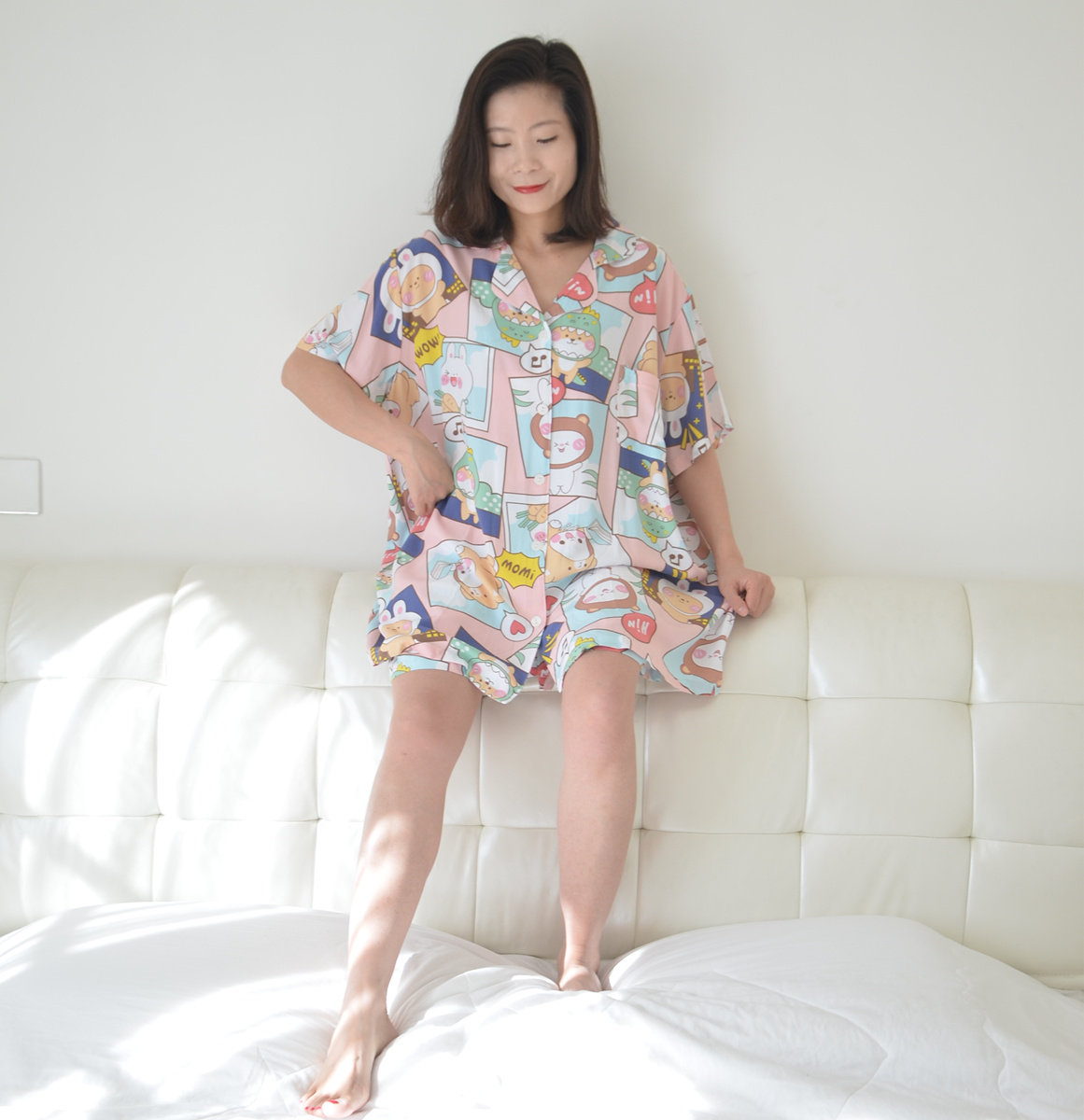 200 catties plus fertilizer plus size cartoon cotton pajamas women's summer short-sleeved shorts washed cotton fat MM home clothes
