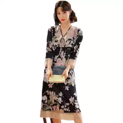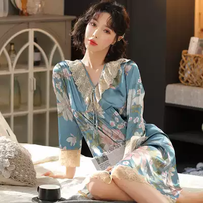 Ice silk pajamas female 2021 spring and autumn Korean version of thin sexy V collar lace nightgown net explosive silk long dress