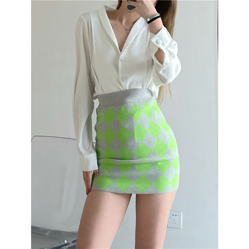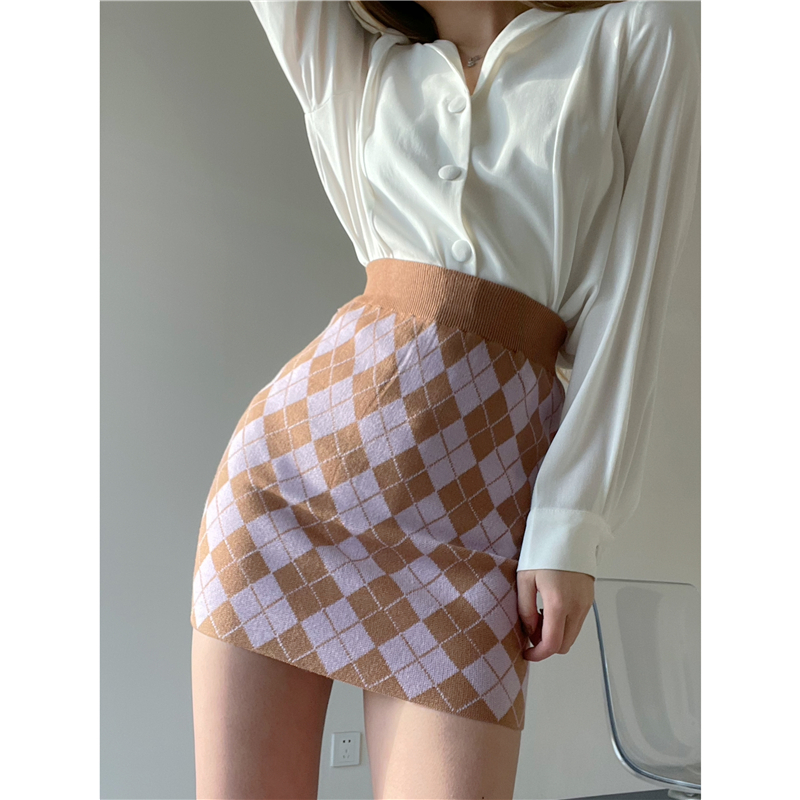 French niche fairy skirt Simple high waist bag hip knitted skirt female plaid spring and summer all-match thin skirt