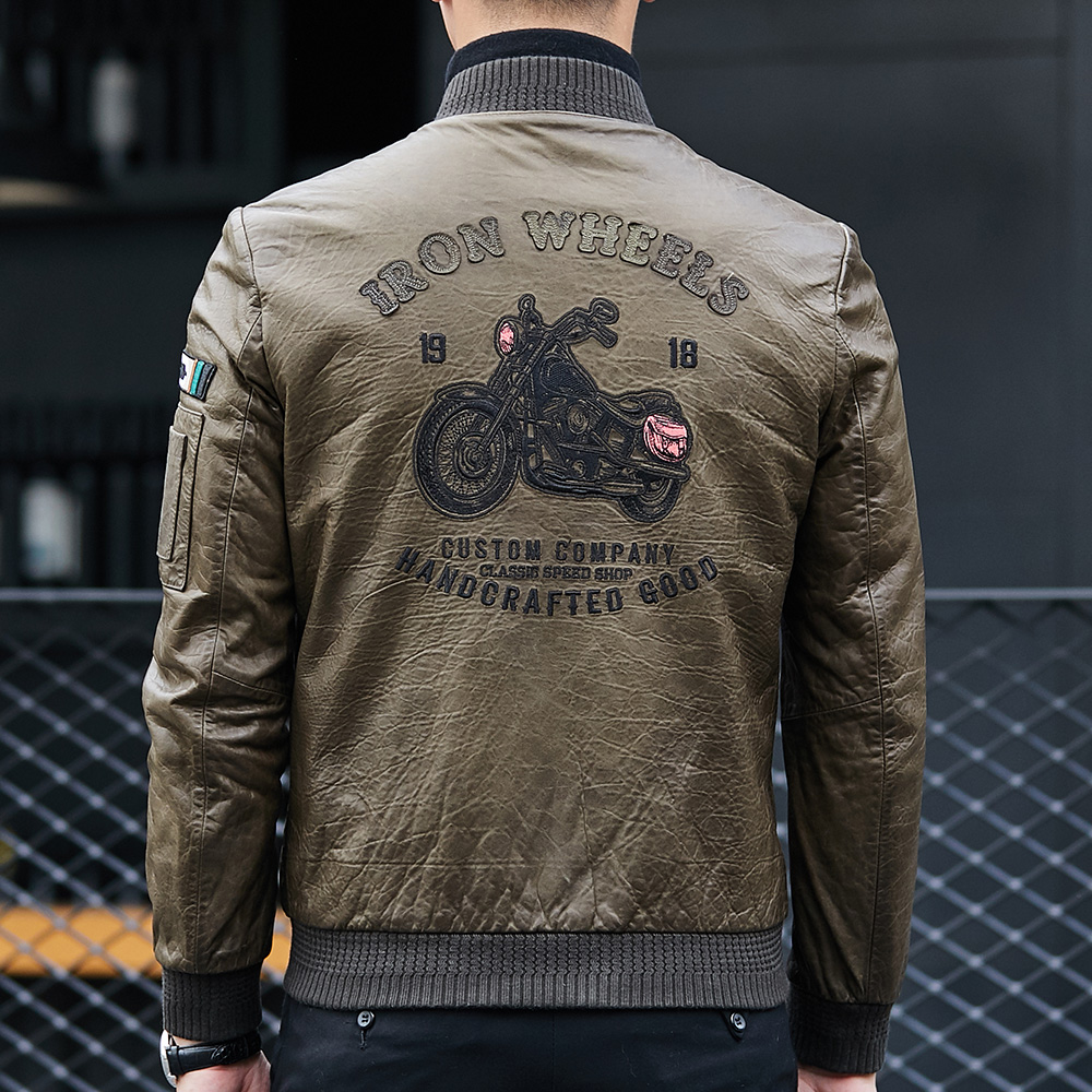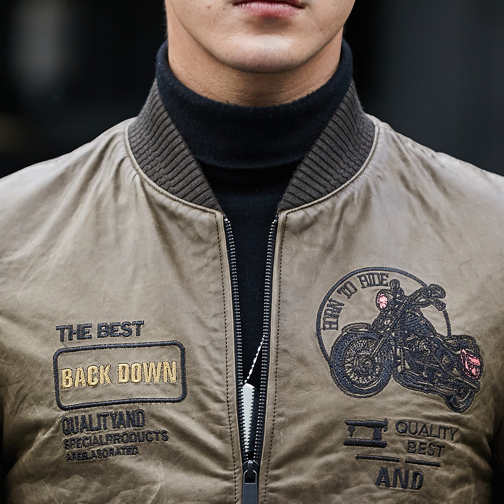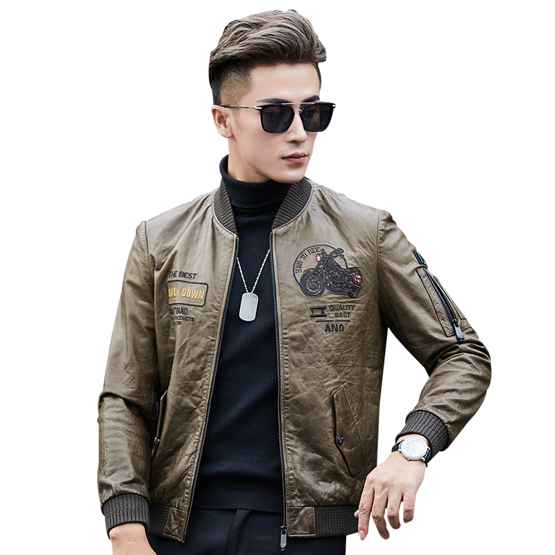 2021 new men's leather leather clothing Short Sheep Leather Jacket Embroidered Baseball Collar Youth Locomotive Clothing Tide Jacket