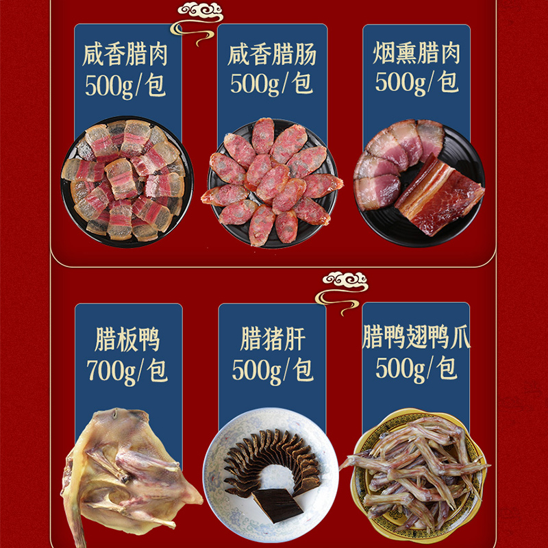 (Gift Box 1)3 pounds of boutique rake meat 2 pounds of boutique sausage (Shopper recommendation) (Gift Box 2)1 pound of boutique bak 1 pound of boutique sausage 1 800g of red hair duck (Gift Box 3)1