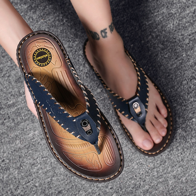 2021 new summer leather slippers men's outdoor anti-slip clip foot beach shoe cold tug men large size herringbone drag Inn