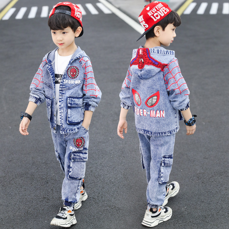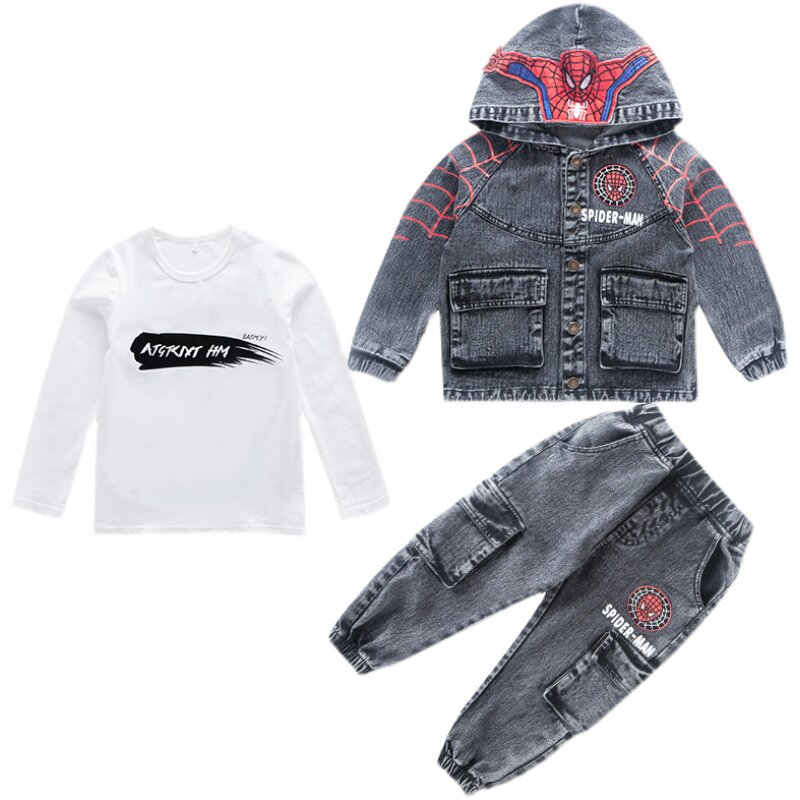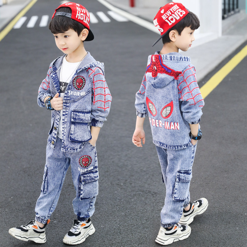 Spider Man Boy Spring Dress Baby Children Suit 2021 New Foreign Pie Handsome Cowboy Clothes Three Sets Of Damp