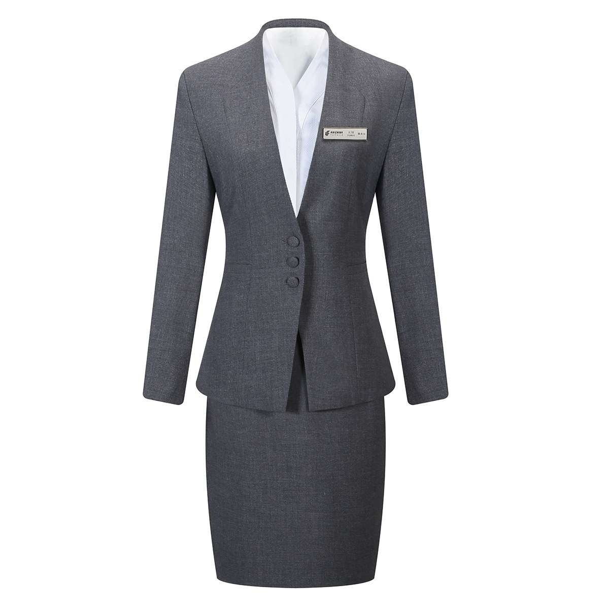 Gray suit + white shirt + gray skirt