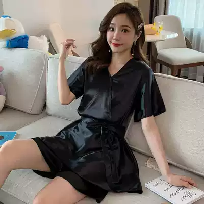 ins pajamas female summer suit new jumpsuit nightgown female summer ice silk suit outside wearing Korean loose student cute
