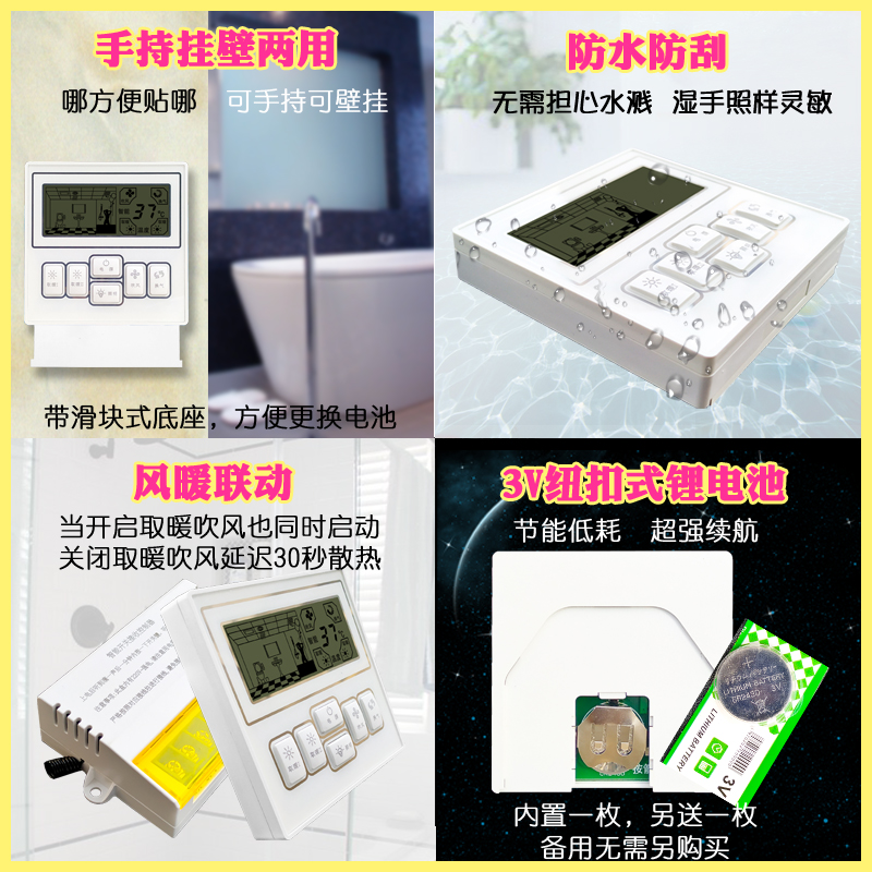 Wireless Bath Bully Switch Battery Intelligent Wind Warm Bath Bully Five Open Switch Button Remote Control Free wiring 86 Type Switch-Taobao