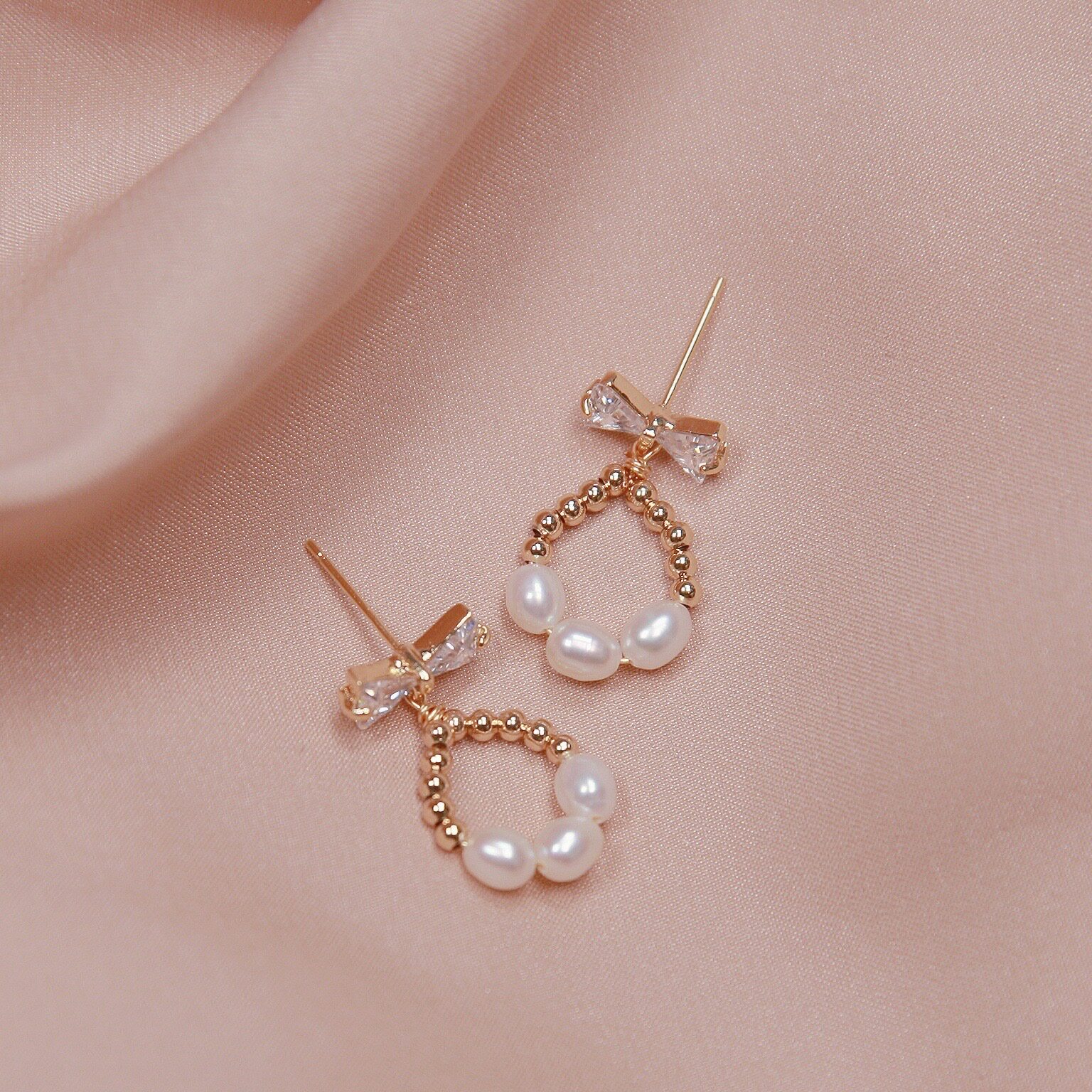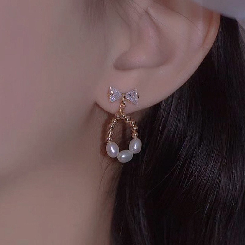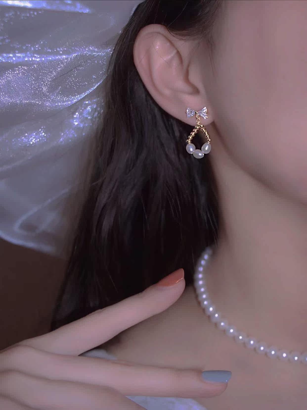 Bow Tie Pearls Pendant Pure Silver Inlaid Diamond Earrings Retro Style Ultra Fairy Sweet Temperament Net Red Earrings Pendant