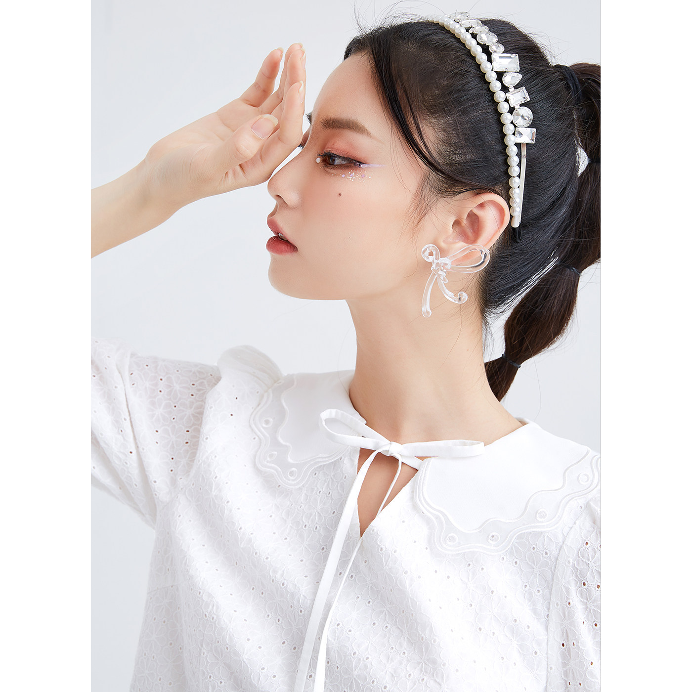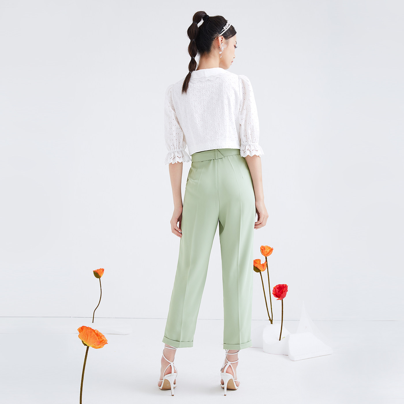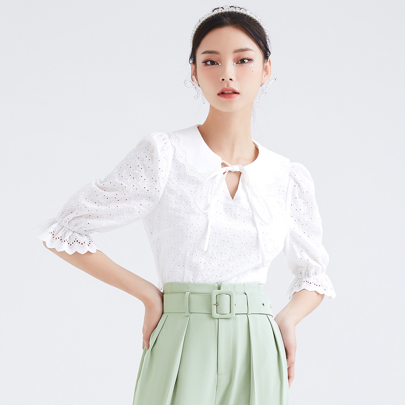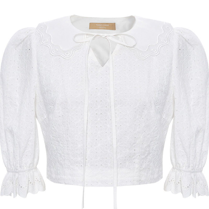(Mall same section) Sugar spring Summer new ticking hollowed-out shirt blouses Peter Pan collar short shirt woman