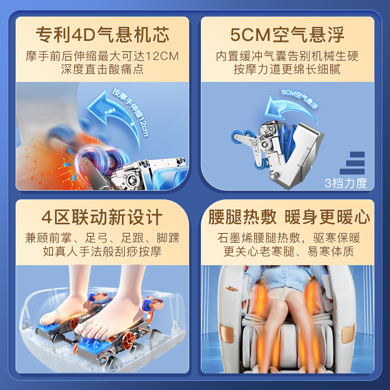 Massage intensity adjustment automatic detection function local hyperthermia roller speed adjustment airbag force adjustment