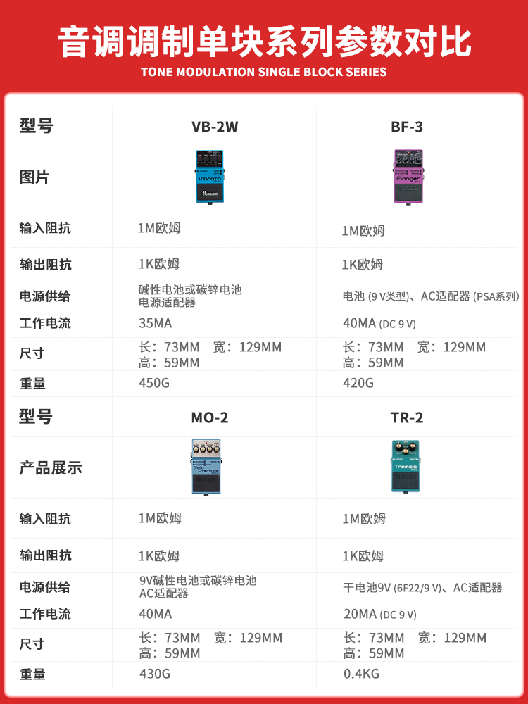 TR-2 (classic vibrato) CH-1 (Super Chorus) CE-5 (chorus) OC-3 (octave effects) BF-3 (trim) PH
