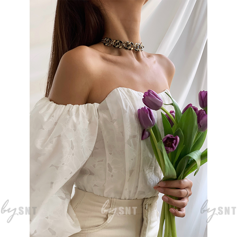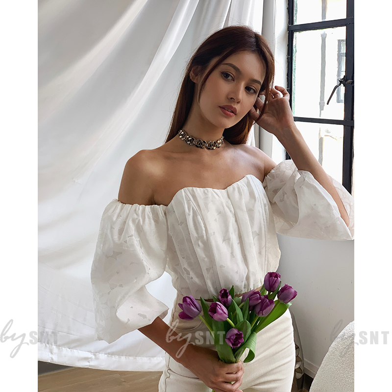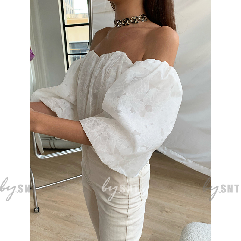 SNT Ace Jacquard lace shirt leak clavicle white pure desire wind word shoulder top short sleeve puff sleeves top woman