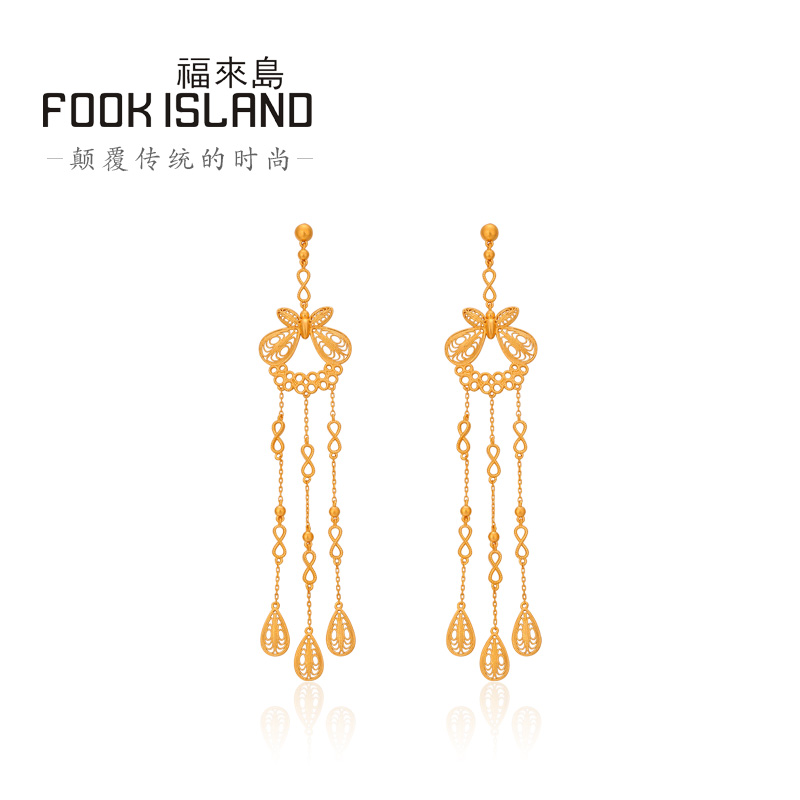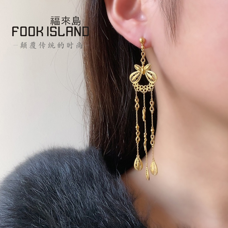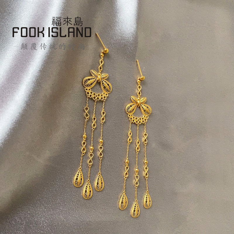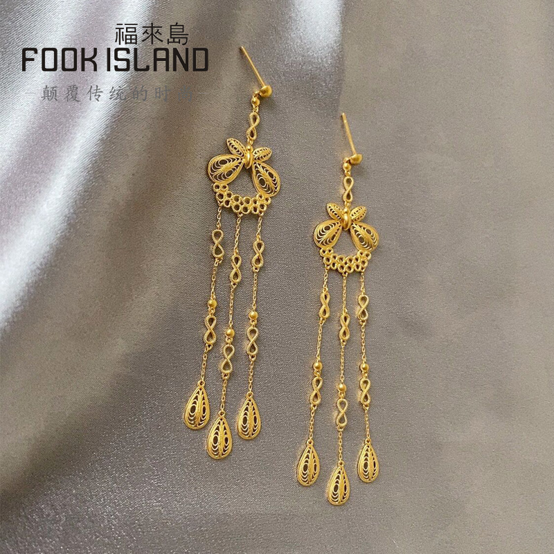 Fulai Island Gold Stud Earrings 999 Pure Gold Earrings Bow Knot Tassel Earrings Women's Fashion Ancient Gold Earrings New Products
