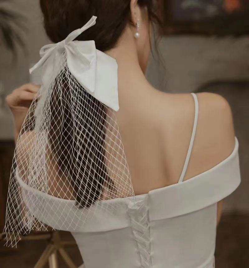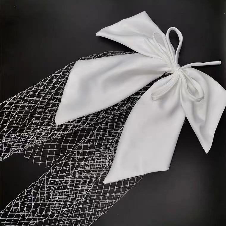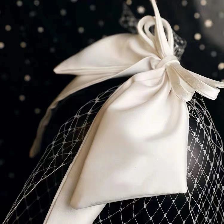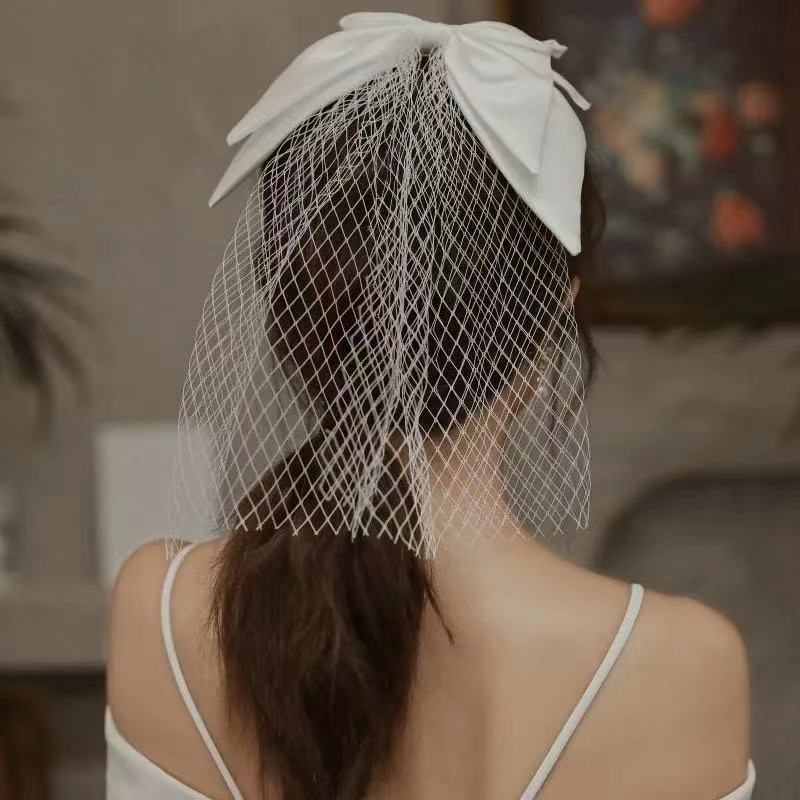 Light yarn headdress super fairy forest white silk retro bow bride marriage certificate small veil photo new
