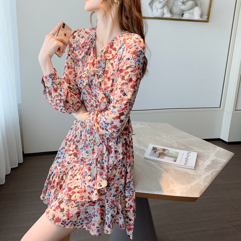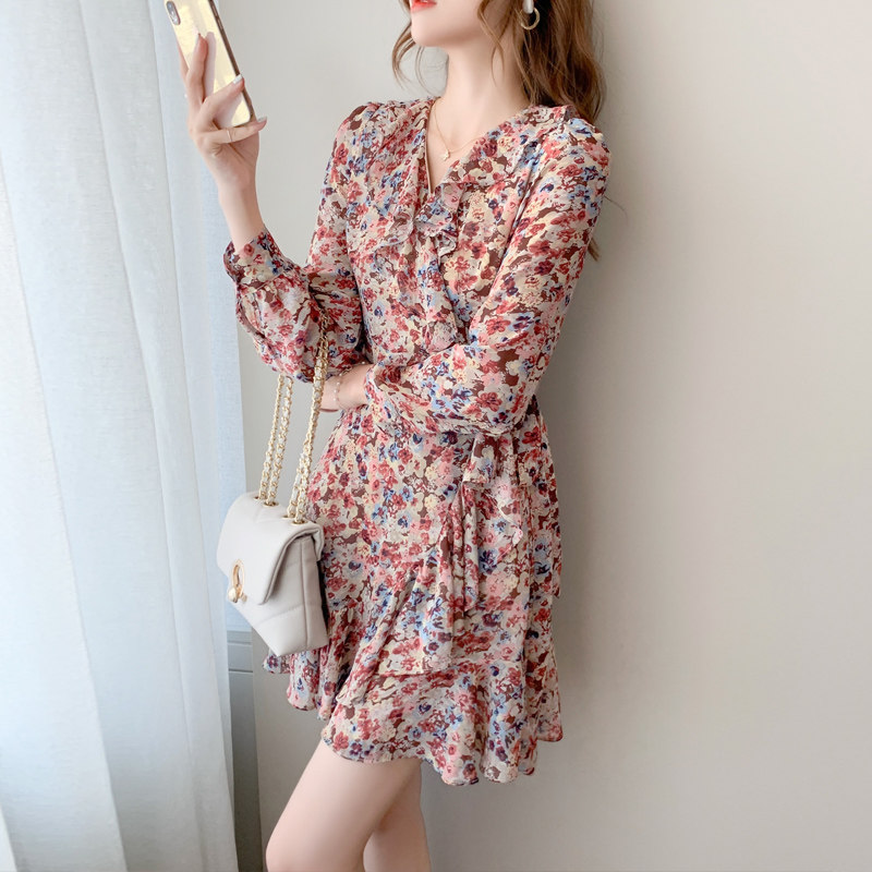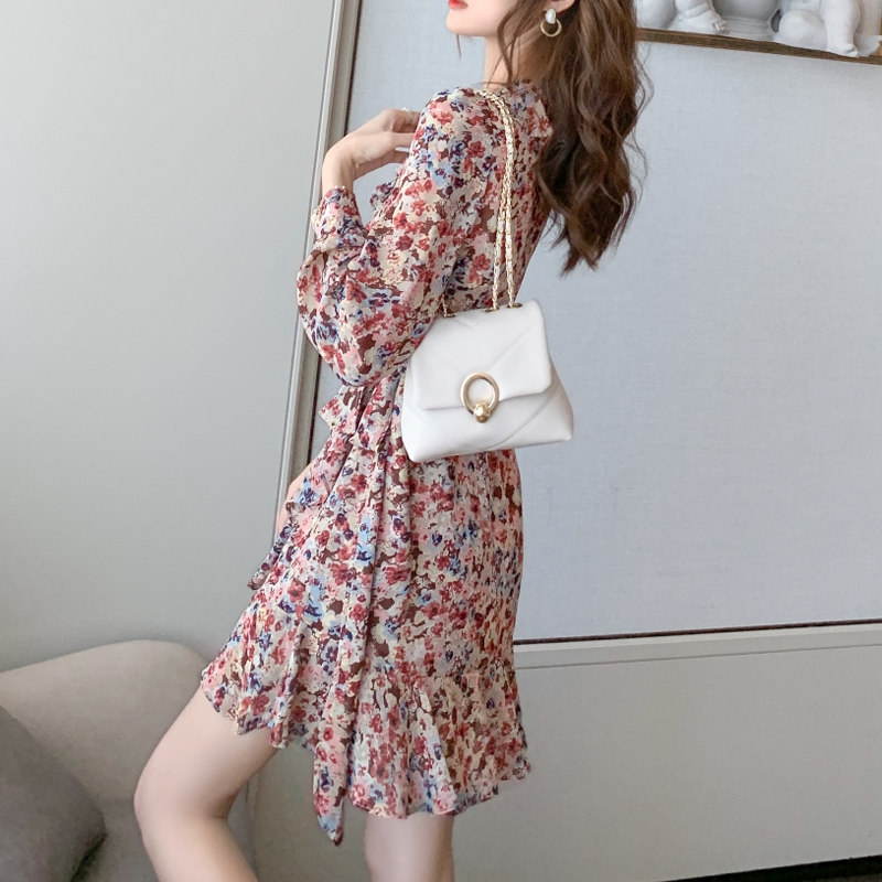 Europe 2022 Autumn new French vintage waist-cinching V-neck temperament ruffled chiffon floral dress women
