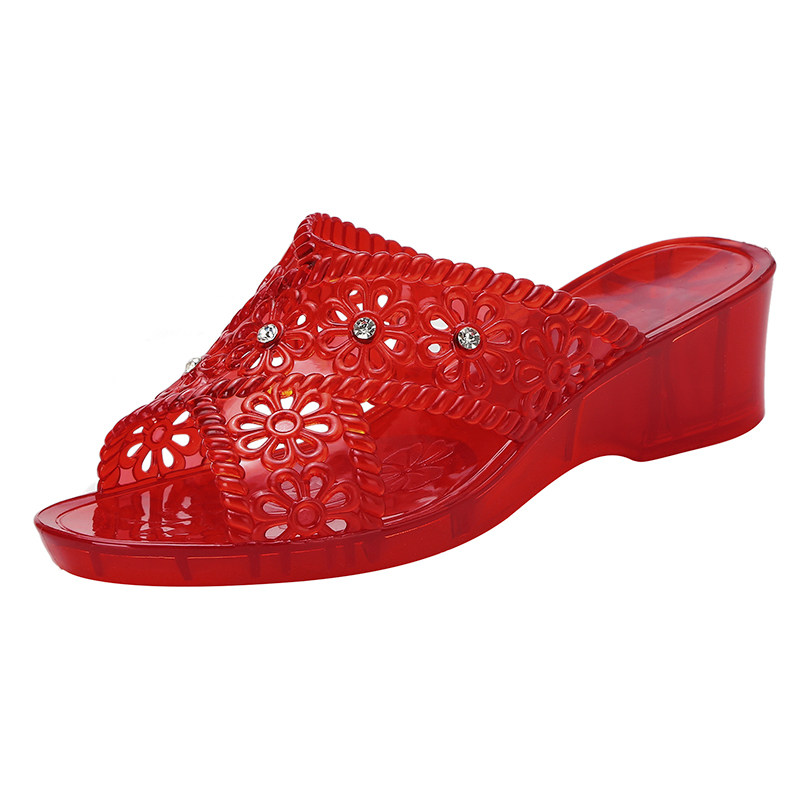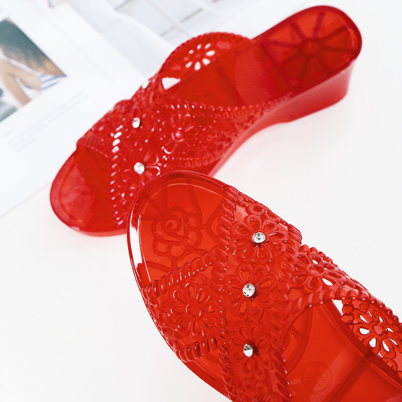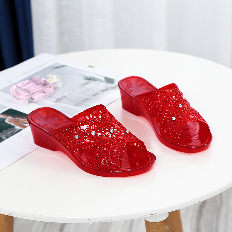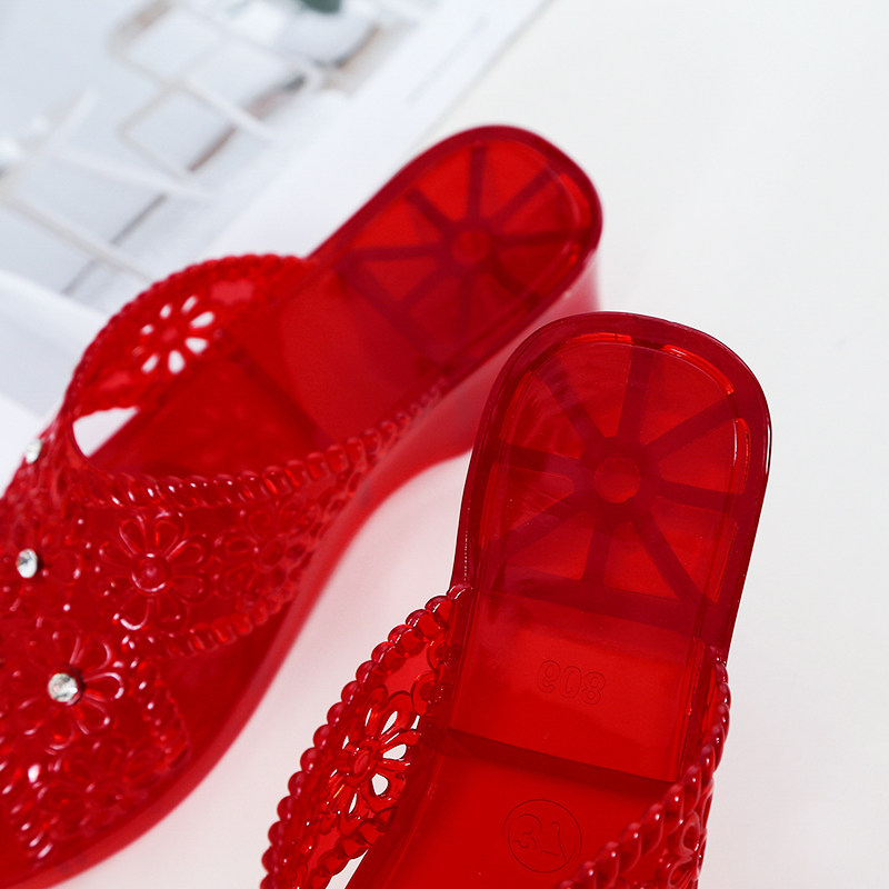 Crystal mesh Red bursting with cool slippers female summer Fashion outside wearing Mom Slope heel with high heel anti-slip jelly slippers
