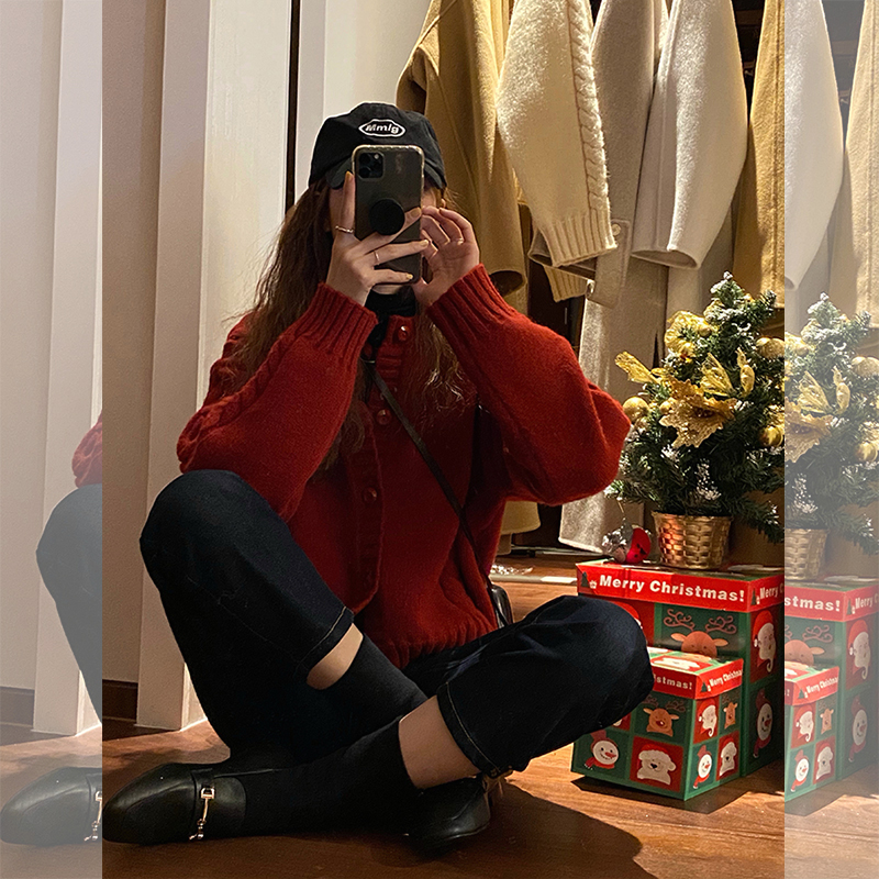 Red knit cardiovert twist with short style Thickened Ben Year Sweater Jacket Woman Spring Autumn Loose Retro Gentle Blouse