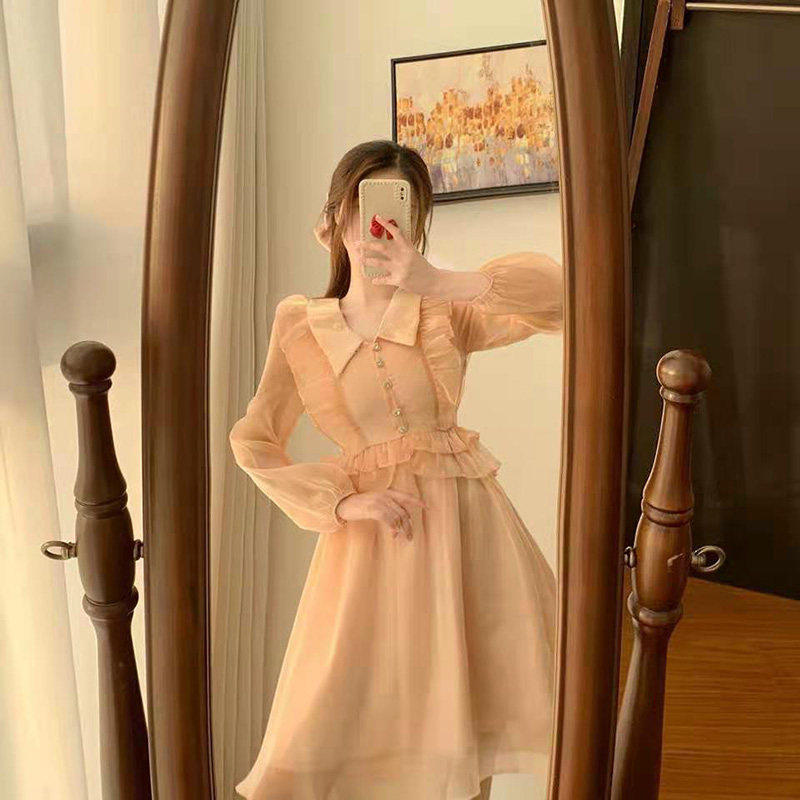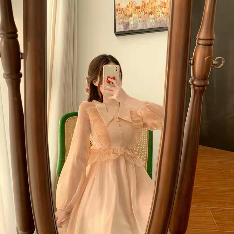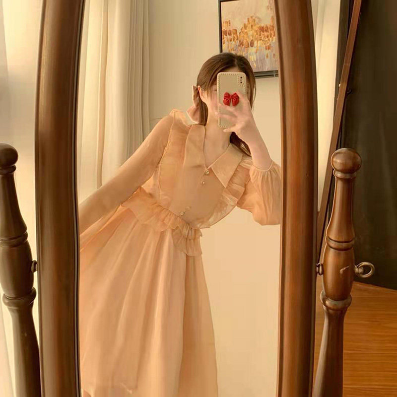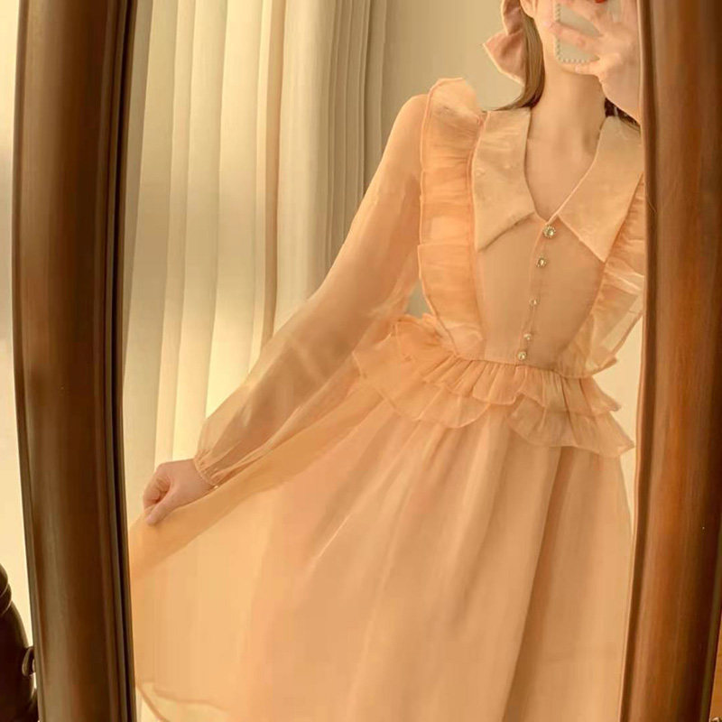 Small ruffle edge vintage dress autumn 2021 new women's waist thin long sleeve mesh skirt