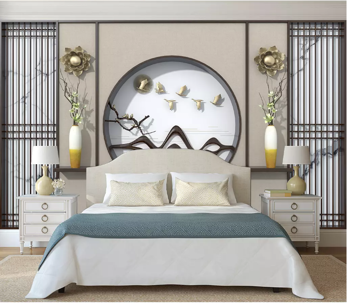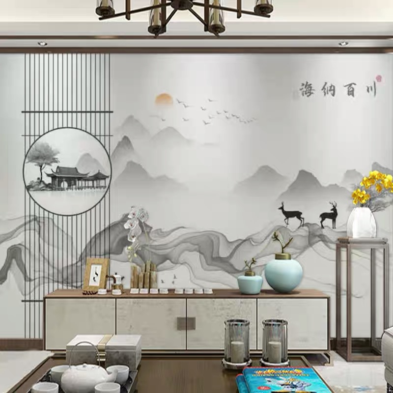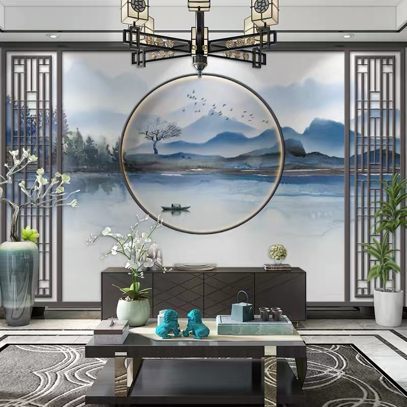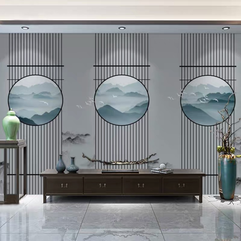 New Chinese WOOD AND WOOD FIBER INTEGRATED TV BACKGROUND GUARD WALL PANEL BRIEF WATER INK LANDSCAPE BUTTONBOARD LIGHT LAVISH LIVING ROOM SOFA