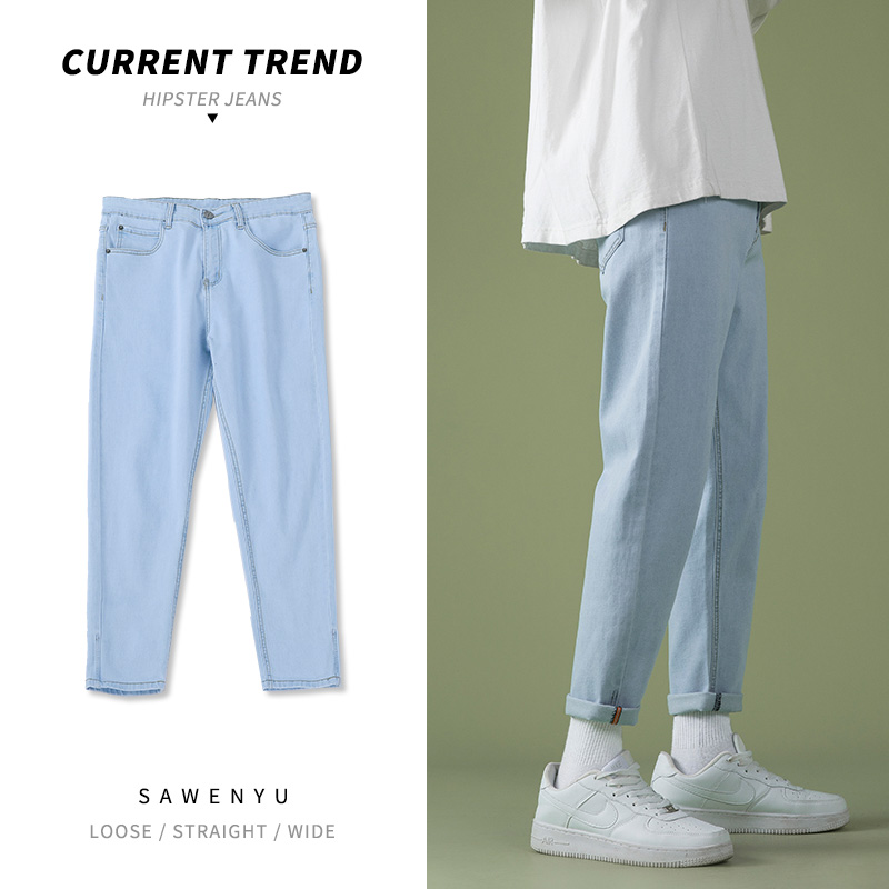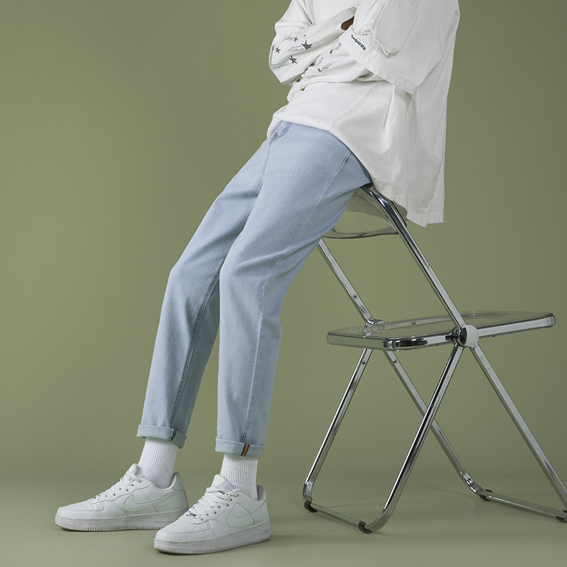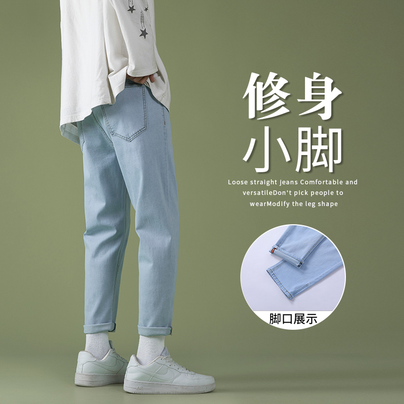 Light Blue Jeans Men's Slim Small Foot Ninth Pants Korean Version Trend Spring Students Handsome Elastic Casual Pants