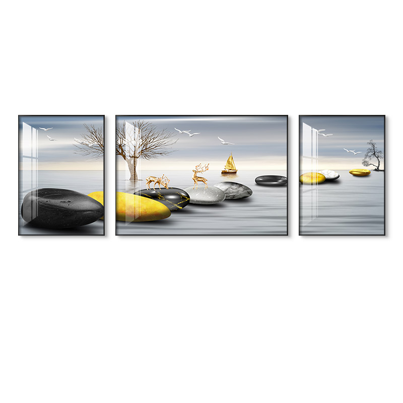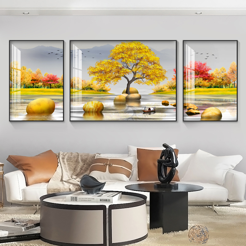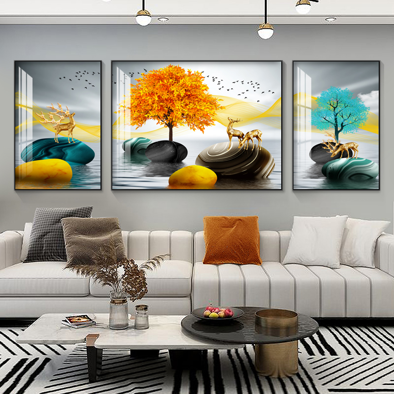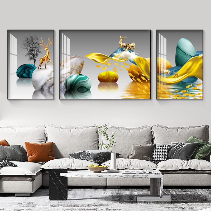 Living room decorated with sofa background wall inlaid with crystal porcelain luxury three-painting hanging painting