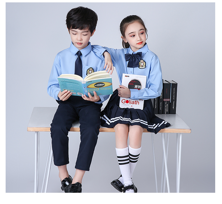 Women's Blue Long Sleeve Top Navy Skirt Women's White Top Navy Blue Skirt Vest Women's Shoes Size Message Men's Blue Top Navy Blue Pants and Vest