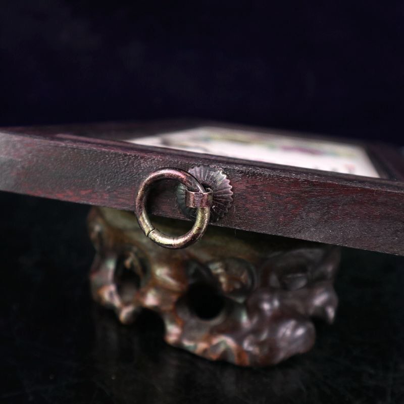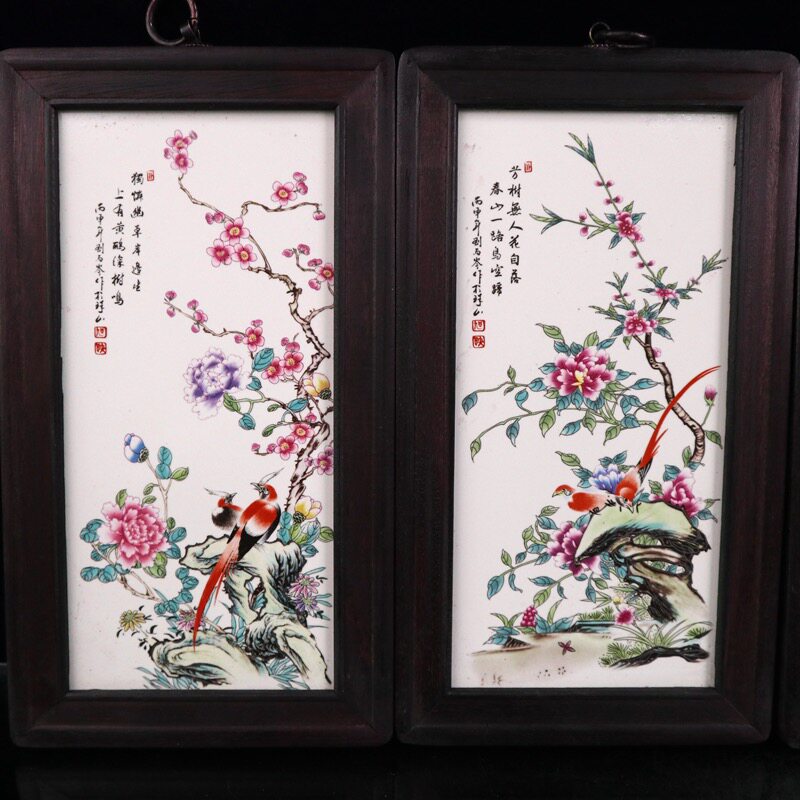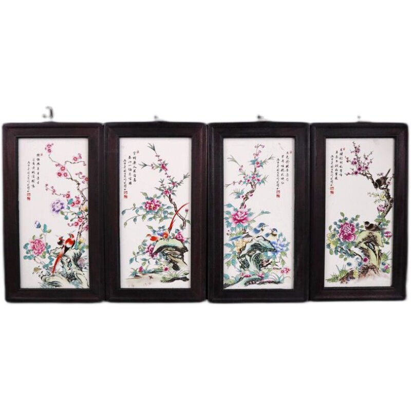 Ceramic painting hand-painted vintage mounting Jingdezhen porcelain plate painting solid wood four-strip screen porcelain plate painting pastel flower and bird figure set