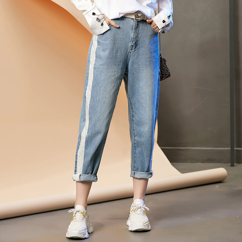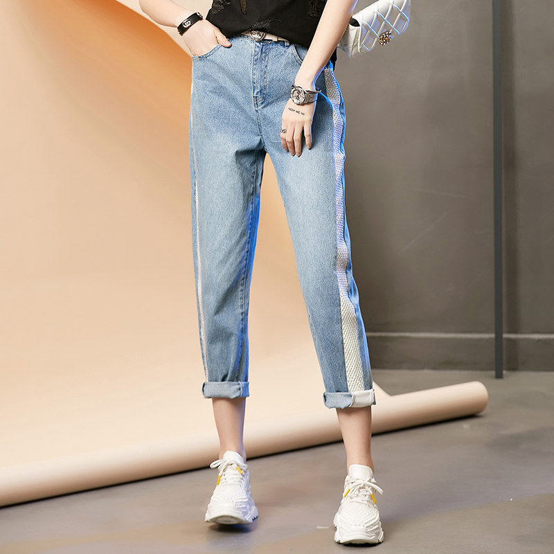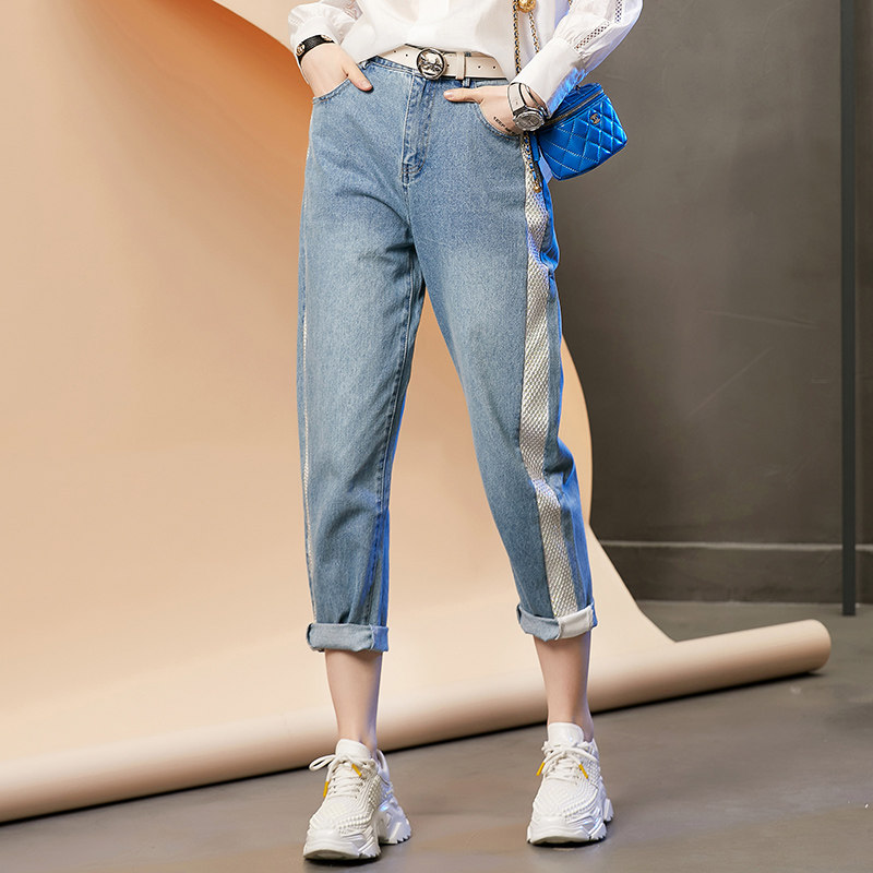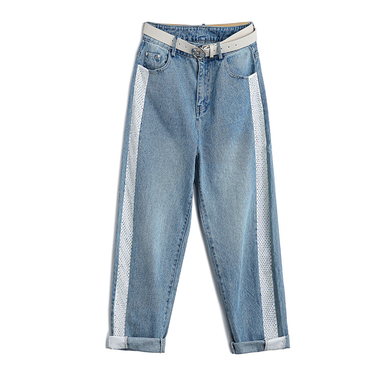 European station light-colored straight jeans women's spring small 2022 new slim slim mesh beaded trousers