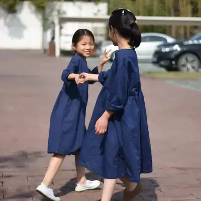 21 New Spring and Autumn Children's Clothing Zhongdai Flax Pure Color Long Sleeve Dress Girls Cotton and Long Skirt Art Fan