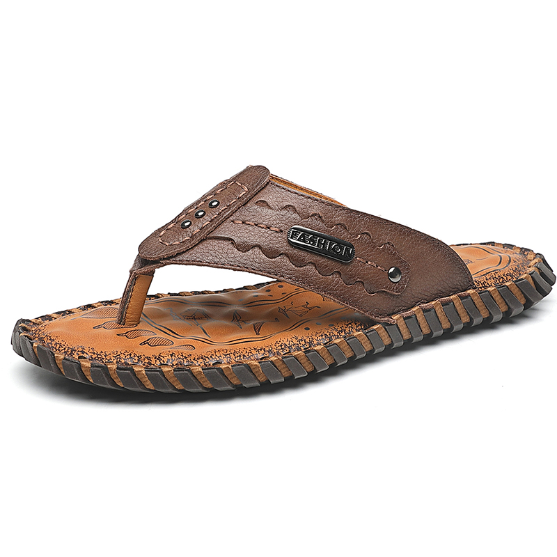 Bull leather slippers men's summer genuine leather herringbone drag men trends non-slip and deodorant soft bottom outside wearing men's beach sandals sandals shoes