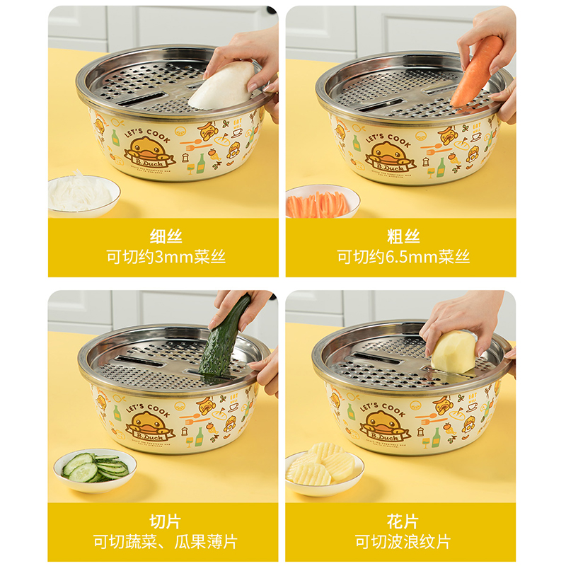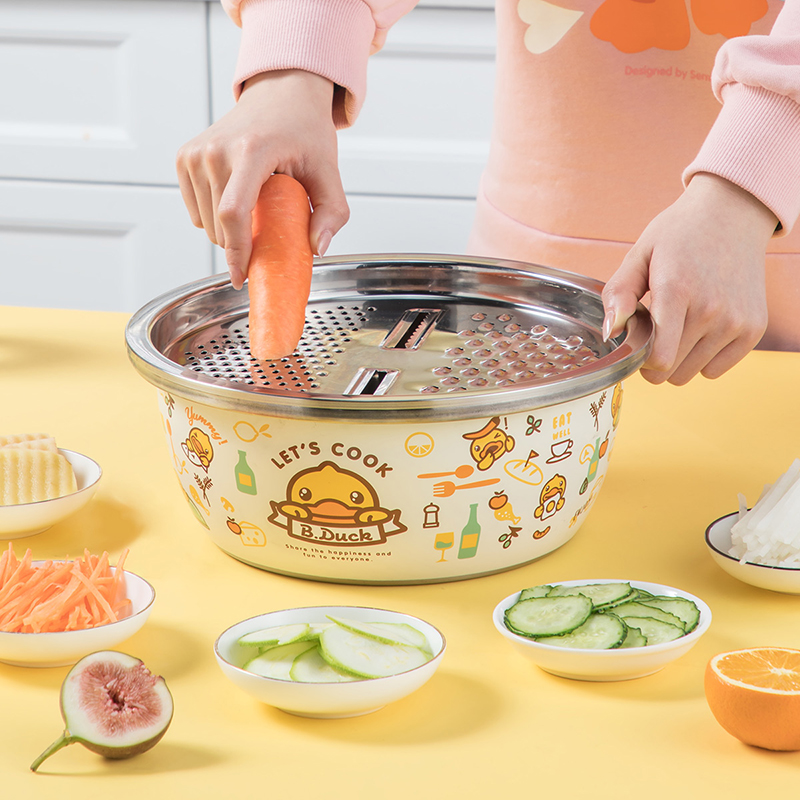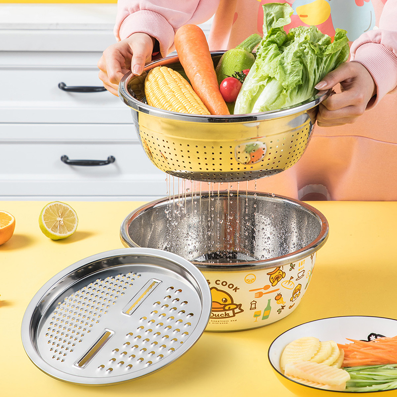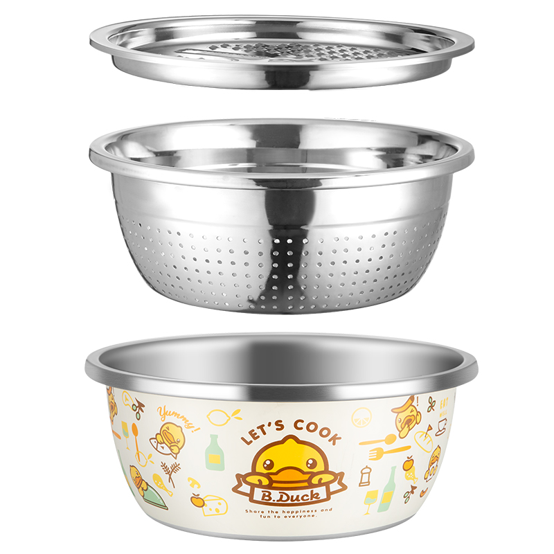 Cook big emperor little yellow duck 304 stainless steel basin Household sieve planer three-piece set of multi-function washing basin storage basin