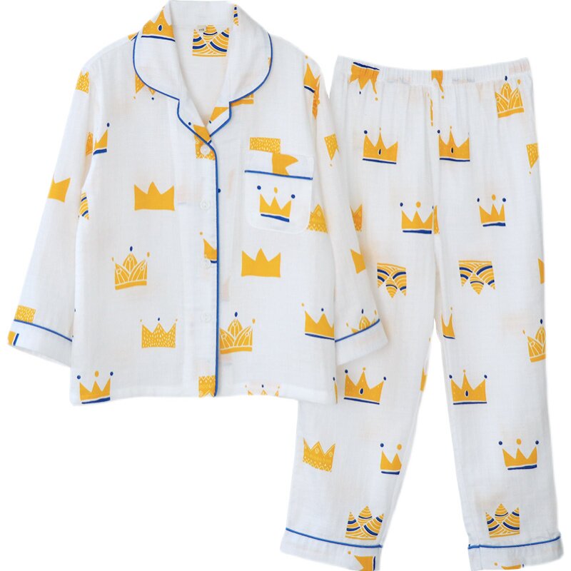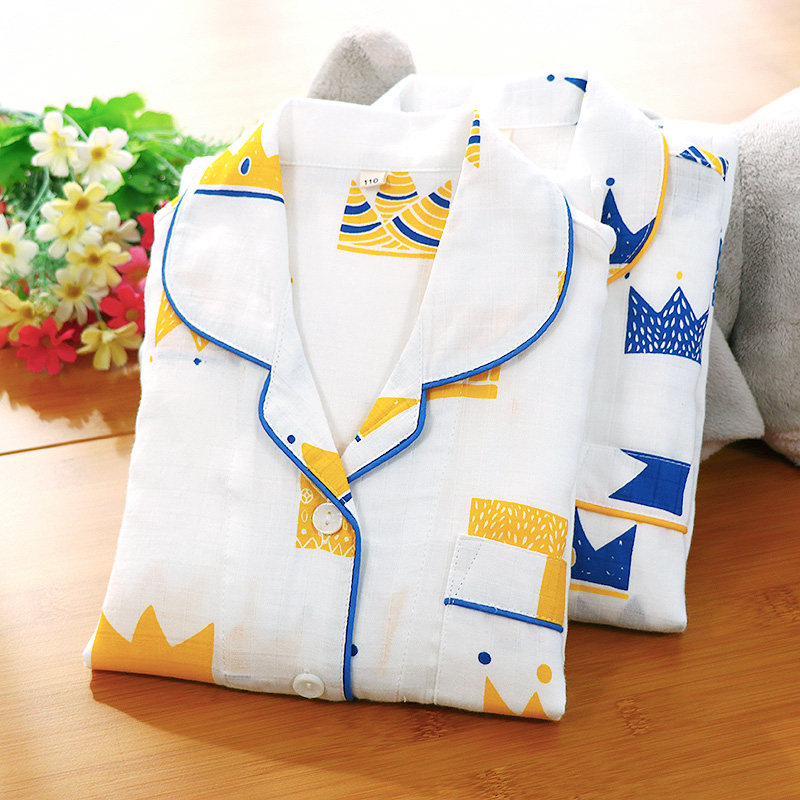 Dark Lattice Crown Boy Sleepwear Spring Summer Thin Full Cotton Double Layer Yarn Long Sleeve Long Pants Suit Flipped Cardiovert Cardiovert