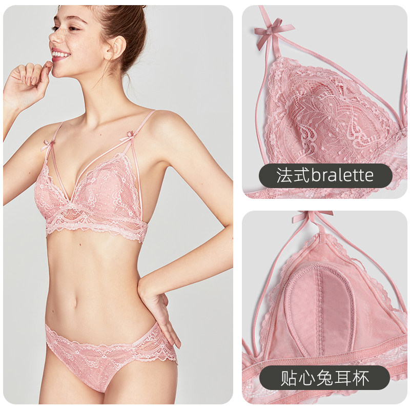 Curious Miss French Lingerie Women's Thin Summer Big Chest Show Small Underwire Bra Lace Set with Straps Sexy Lace Set