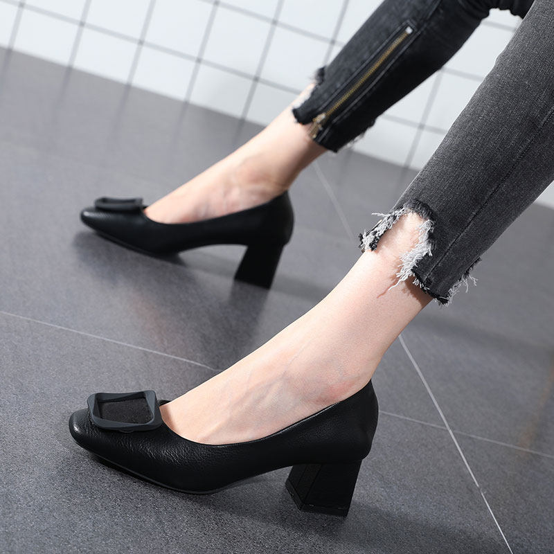 Square toe grandma shoes women's thick heel 2022 spring and autumn new leather square buckle women's shoes all-match shallow mouth medium heel bag shoes