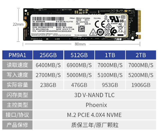 Samsung Samsung PM9A1 256G 512G 1T 2T PCIE4 0x4 NVME solid state drive