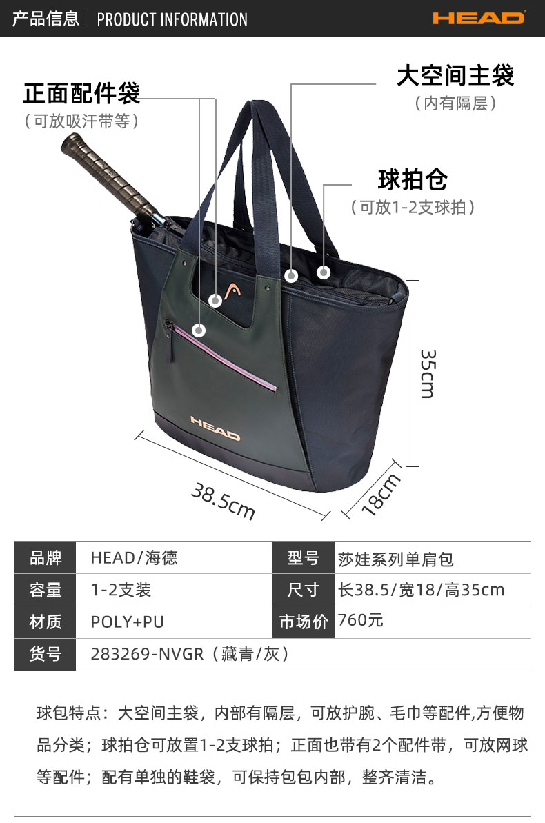 Heide HEAD Women's Tennis Bag Wall Ball Bag Badminton Bag 2-3 clothes