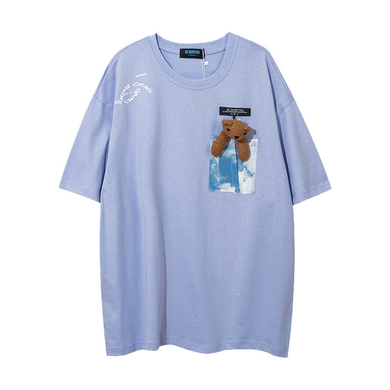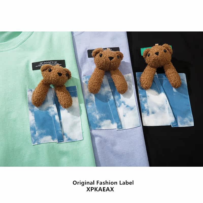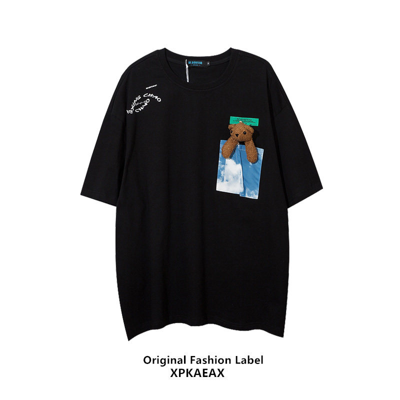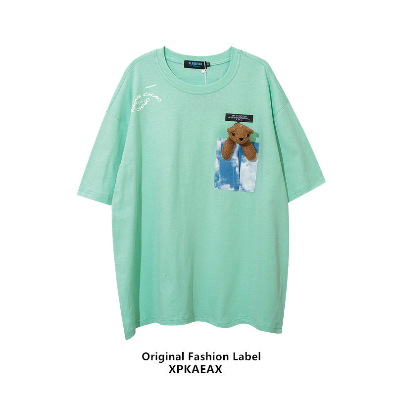 XPKAEAX Original Tide Card Three-dimensional Doll Small Bear T-shirt Male and Men's Tongan Trend 100 Hitch Loose Short Sleeve Summer