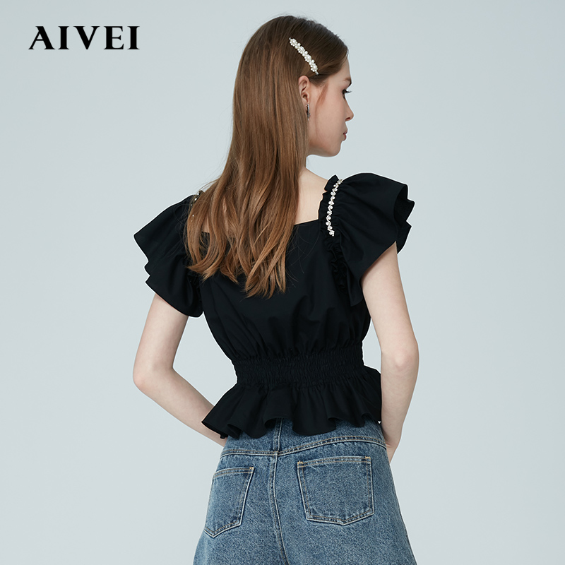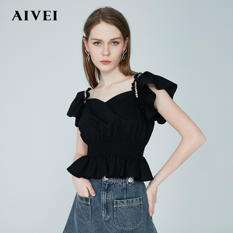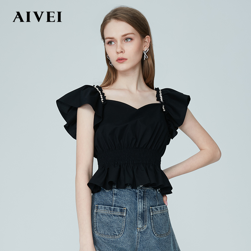 AIVEI Xinhe Ivy 2021 summer new Port wind square collar beaded elastic waist bolero N036S016