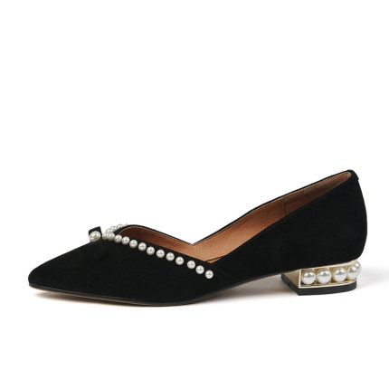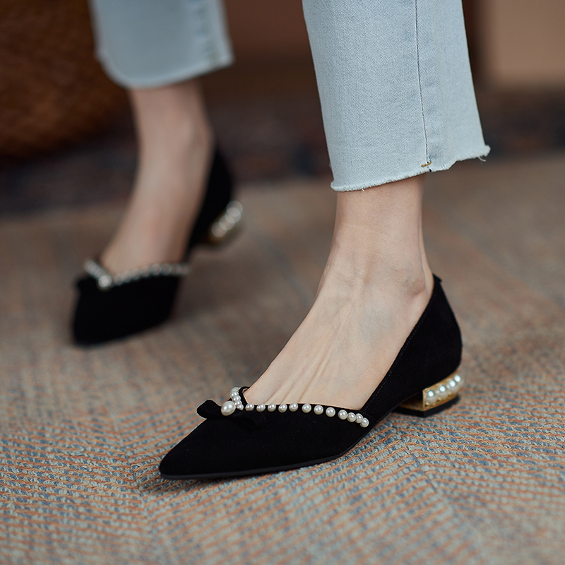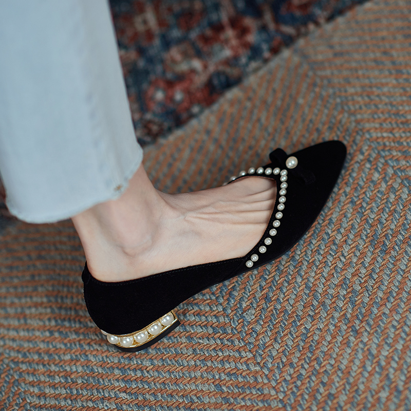 GANAIER niche design French pearl heel pointed bag shoes leather flat shoes sweet shallow mouth women's shoes