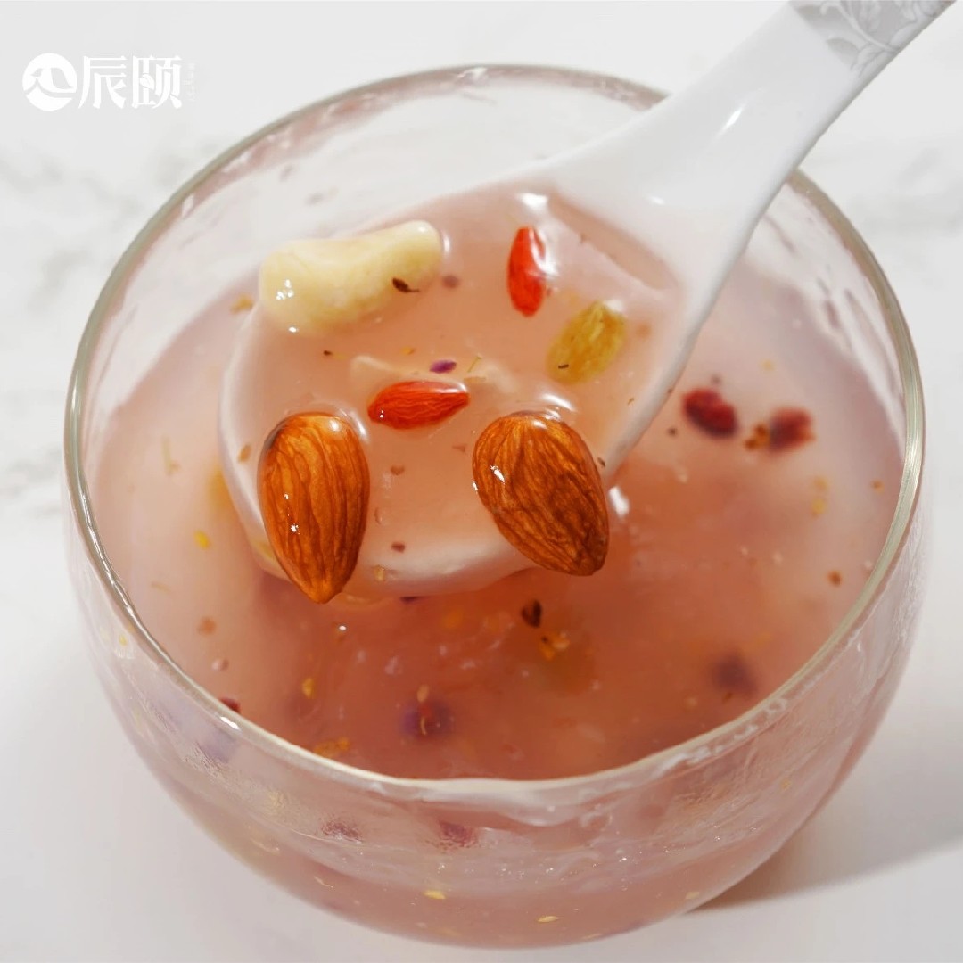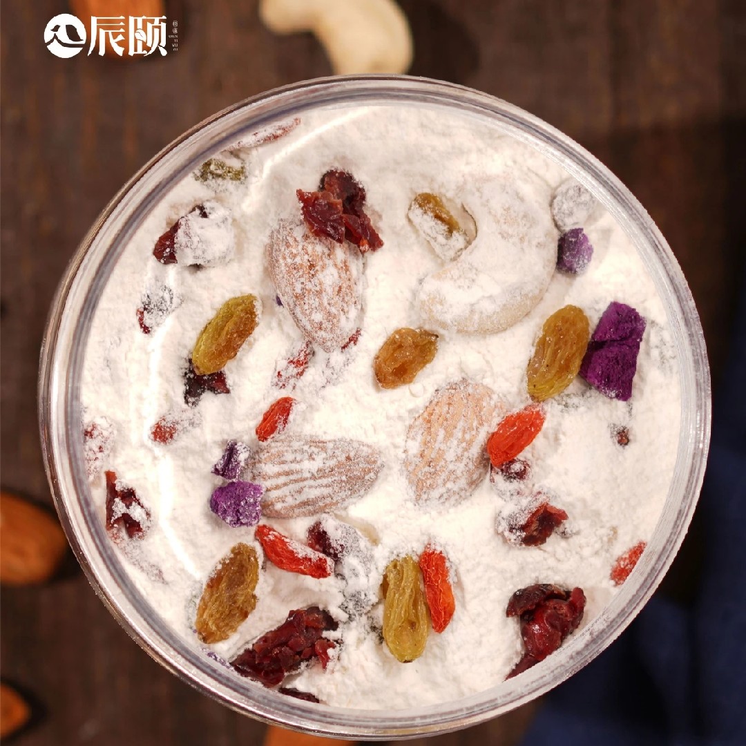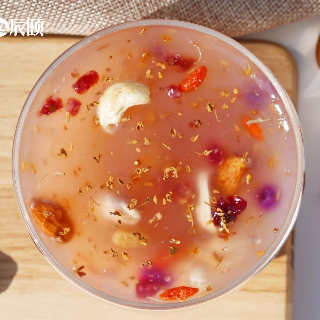Root powder, rock sugar, raisins, cashew nuts, dried cranberries (cranberry white sugar, sunflower oil), almonds, freeze-dried purple potatoes, sweet-scented osmanthus, wolfberry, and beetroot juice powder