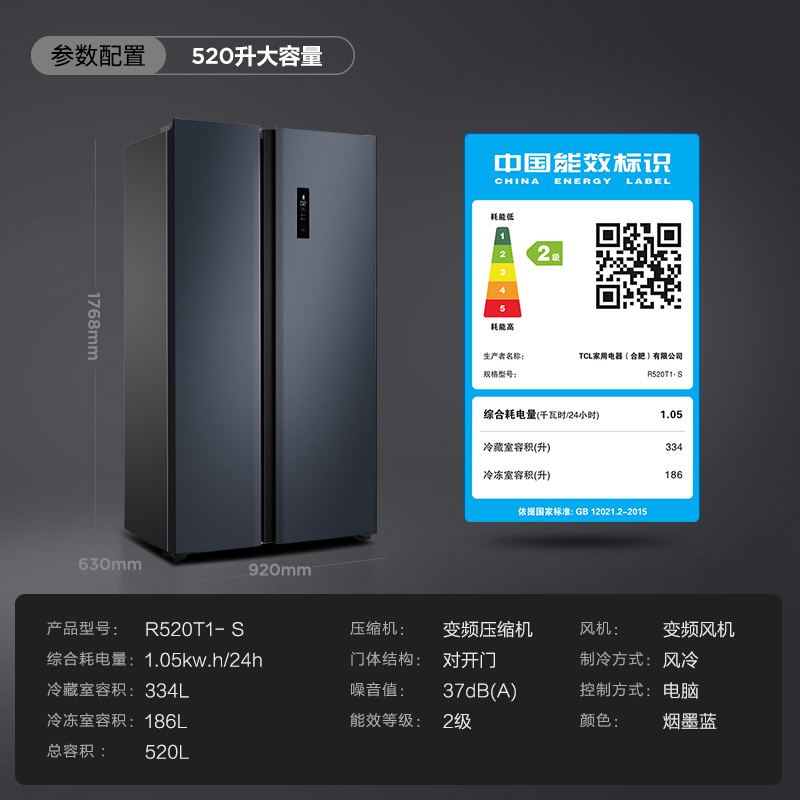 TCL520 liter double-door refrigerator with double-door air-cooled frost-free frequency conversion energy-saving intelligent ultra-thin household large-capacity