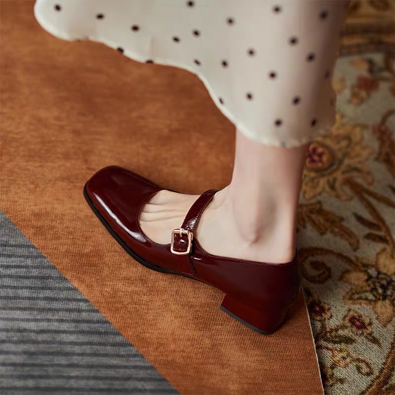 GANAIER heavy new push retro leather thick heel Mary Jane shoes one word buckle in the heel square toe shoes women