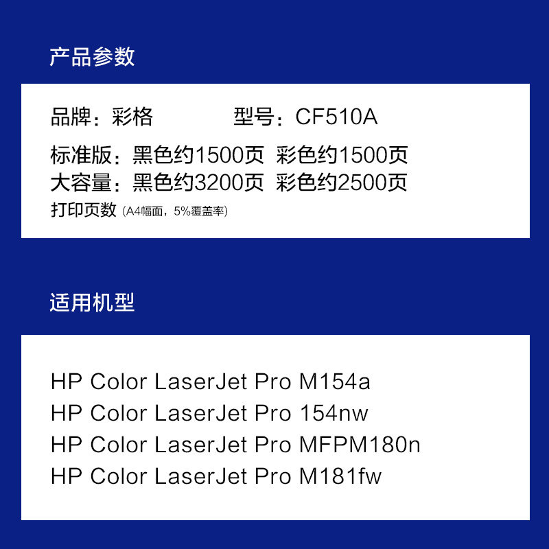 CF510A Black Standard version Toner Cartridge CF511A Blue standard version Toner Cartridge CF512A Yellow standard version Toner Cartridge CF513A Red Standard version Toner Cartridge CF51
