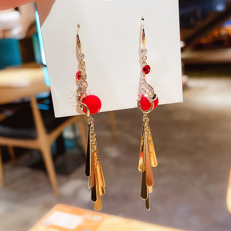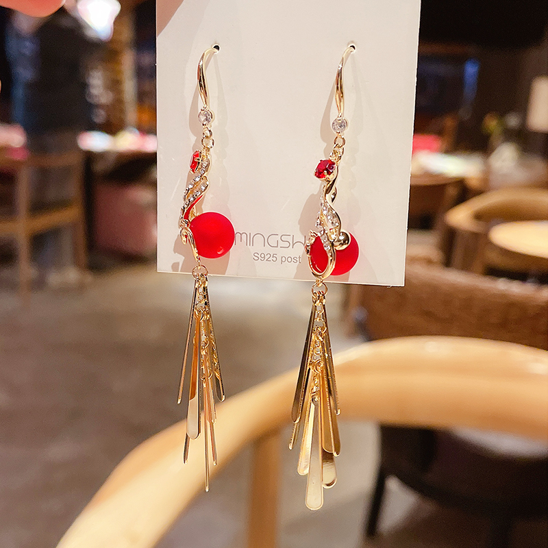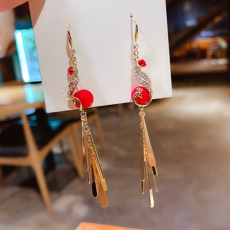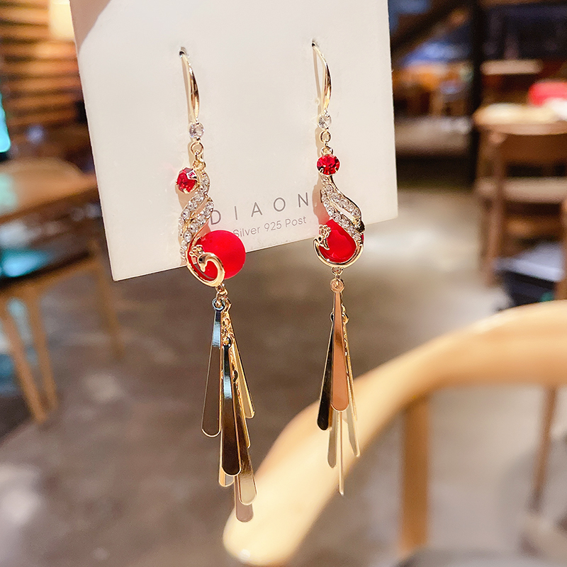 Long version of red phoenix metal sequin earrings Temperament Net Red Without Ear Clip Round Face slim Ears Pendant Woman