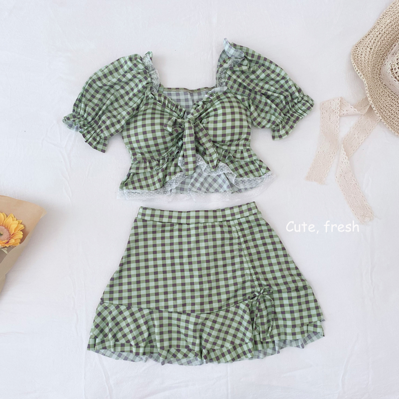 Split student swimsuit female conservative skirt to cover the belly, thin and fresh, plaid, small chest, gathered girl cute swimsuit