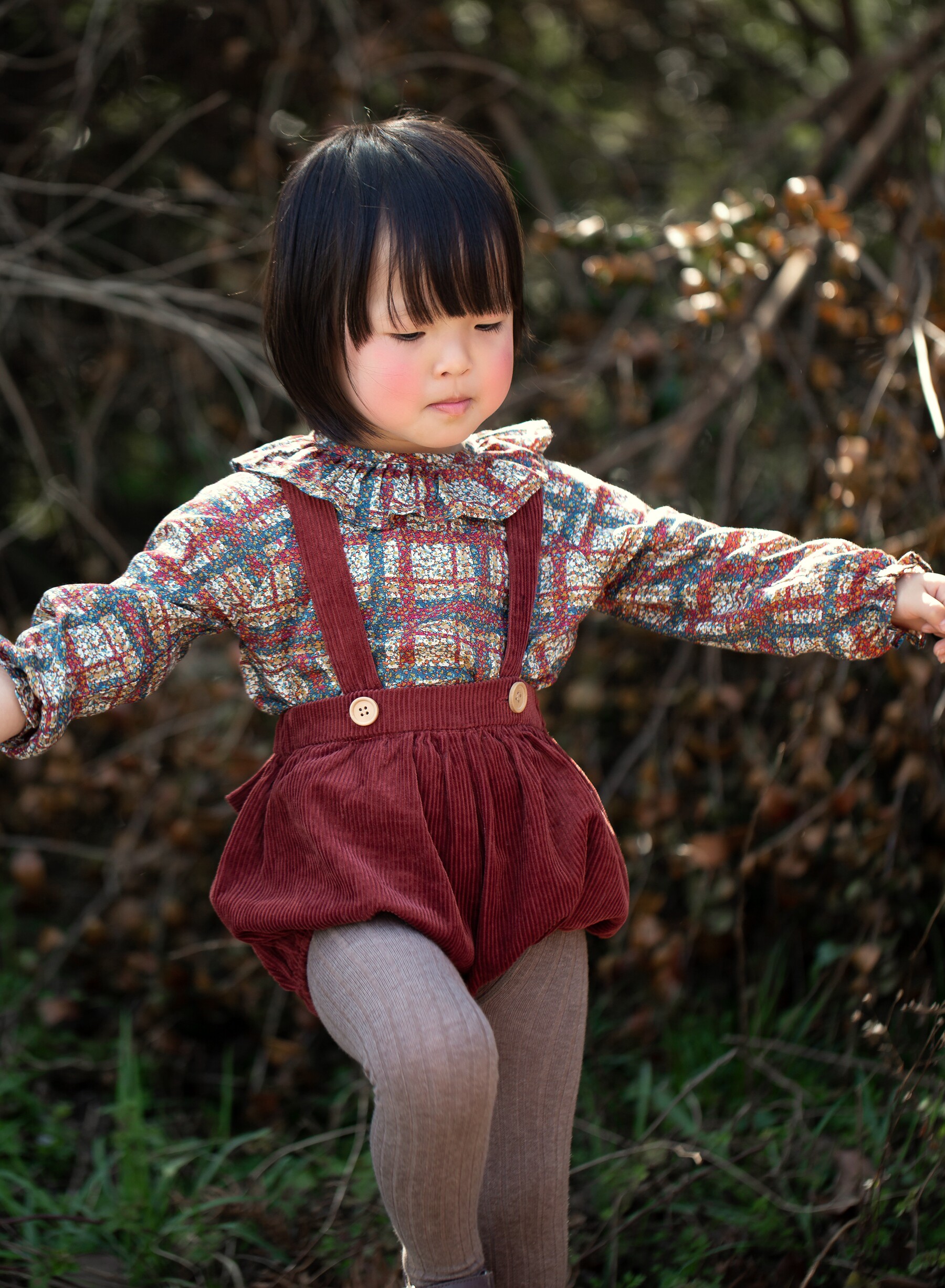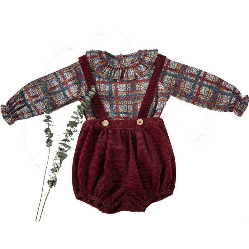 Early autumn and winter new girls Liberty lotus leaf collar shirt wine red corduroy baby bag pants suit