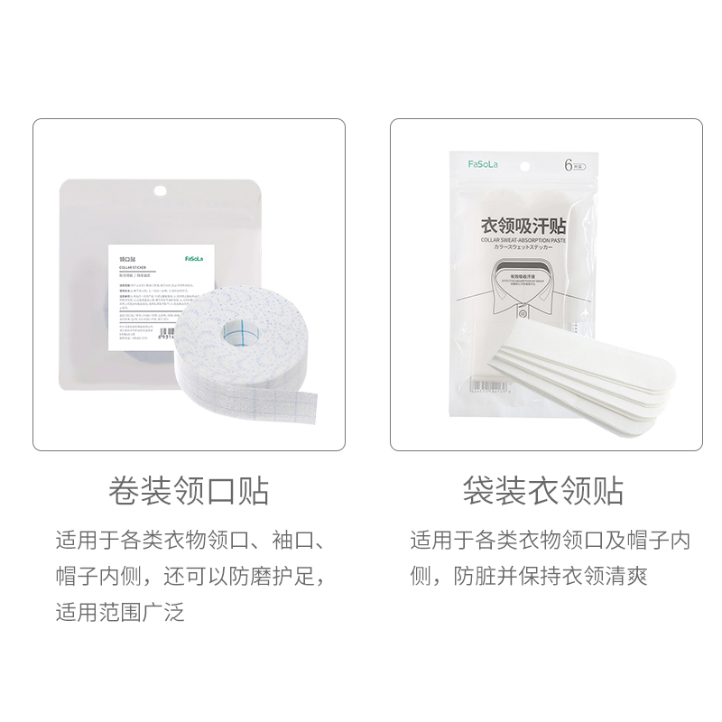 Roll mounted neckline sticker (1 roll 8m) roll mounted neckline sticker (2 rolls 16m) bagged coat collar sticker (1 bag of 6 pieces) bagged collar sticker (2 bag 12 pieces)