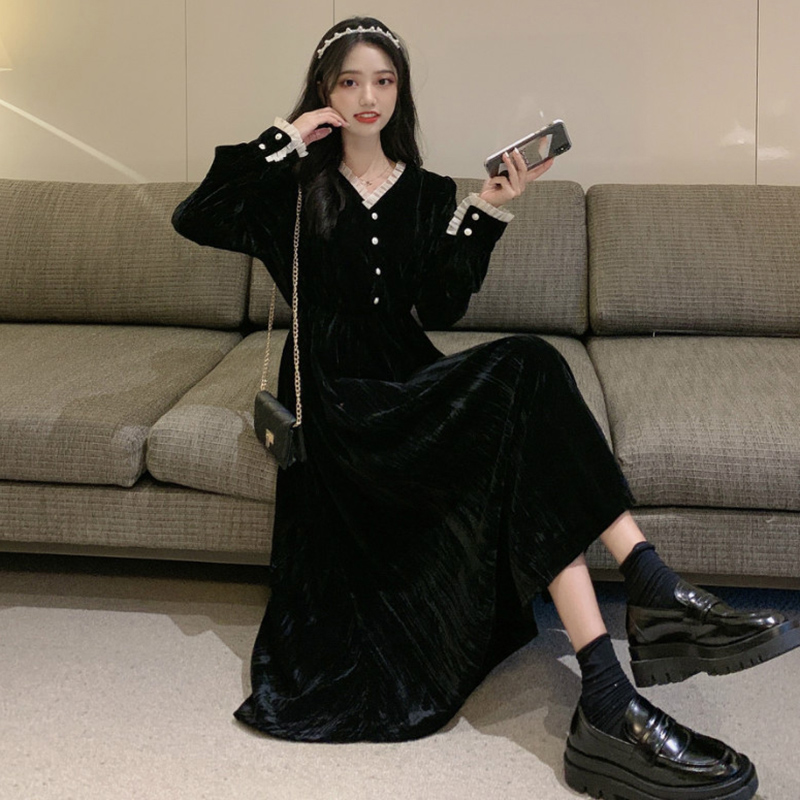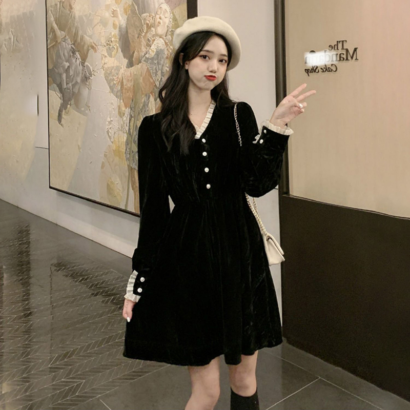 Small French dress with Hepburn style little black dress v-neck base black gold velvet dress female autumn and winter